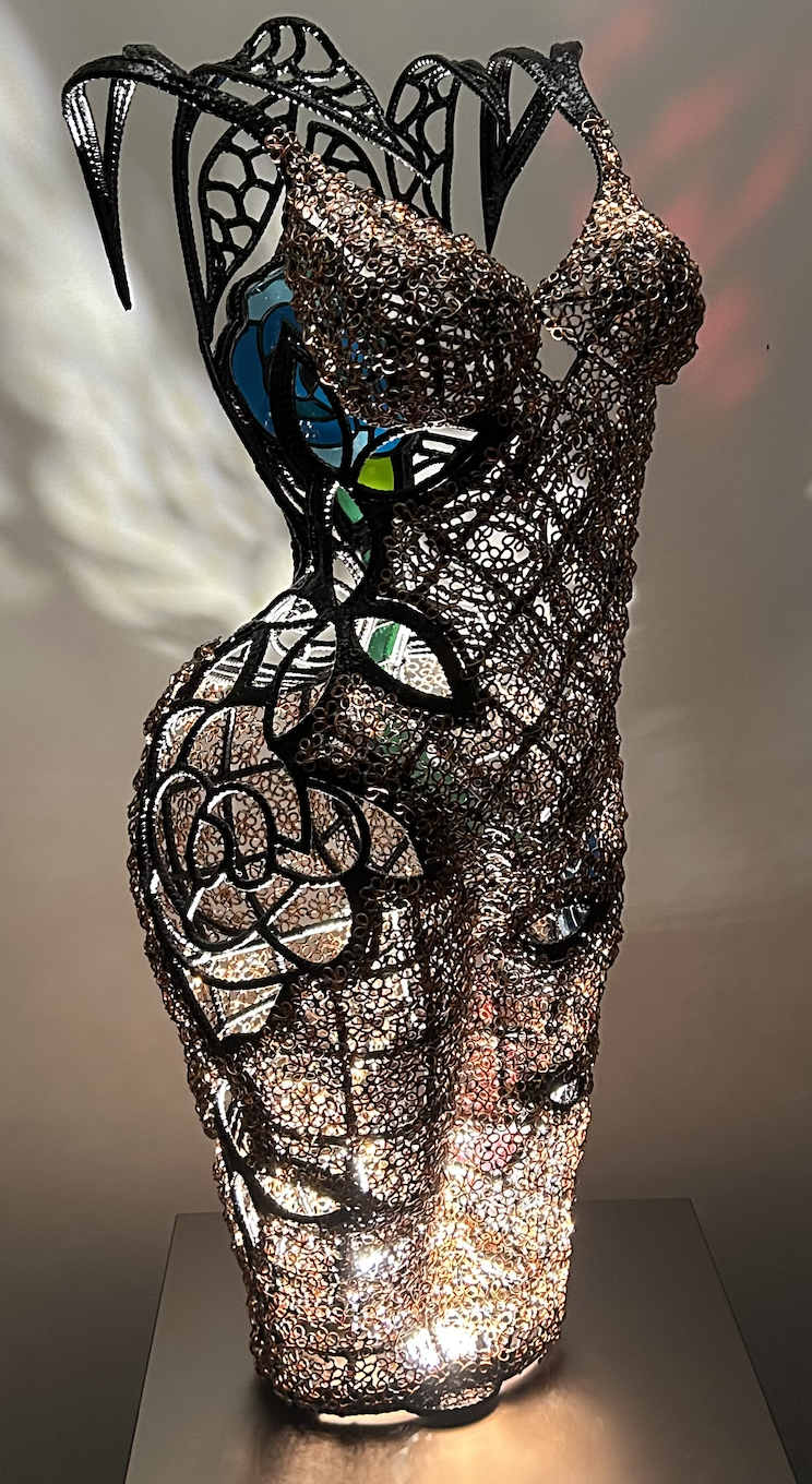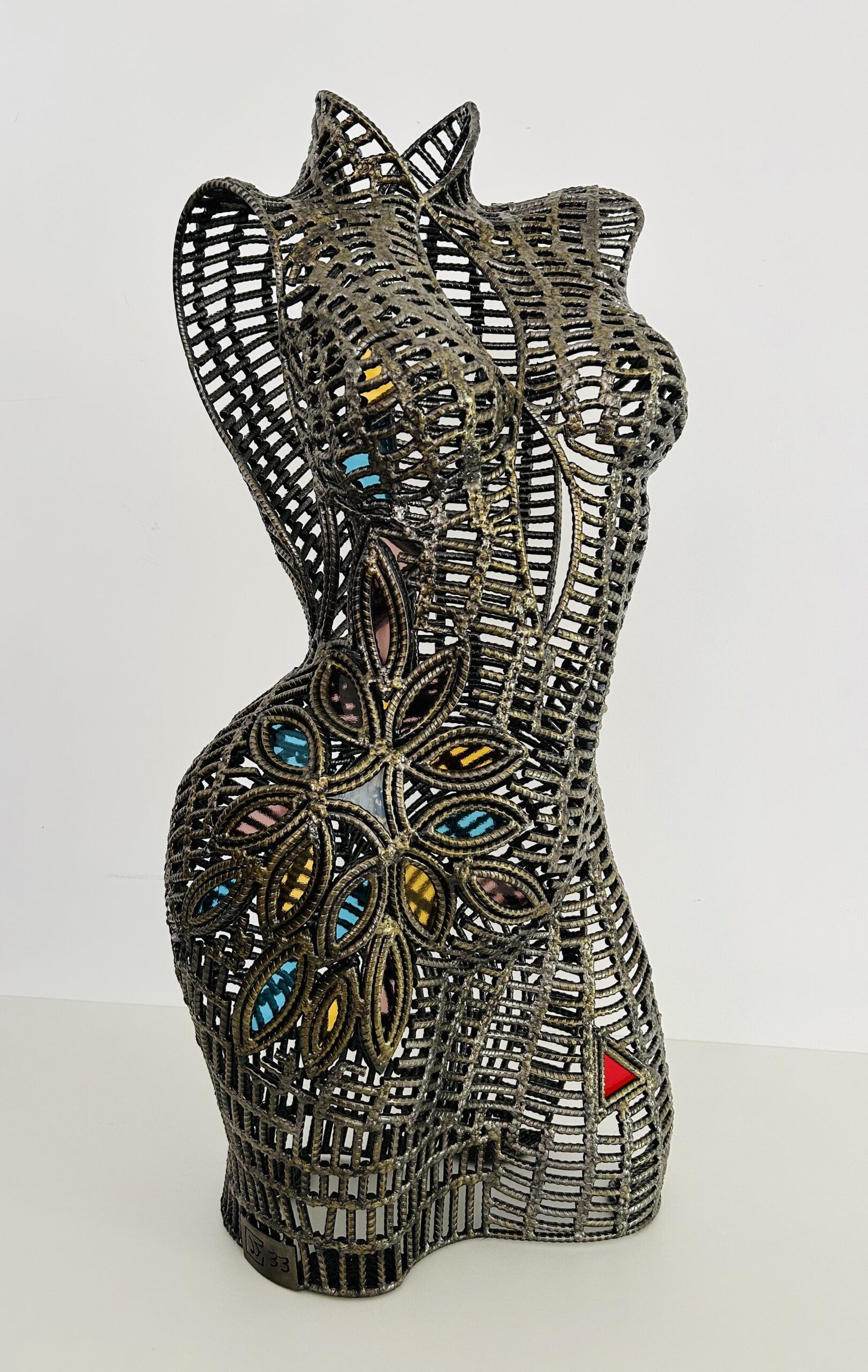 Deux matériaux que tout oppose, banalité et froideur du fer à béton, noblesse et chaleur du vitrail, réunis en parfaite harmonie pour donner vie à des bustes équilibrés.