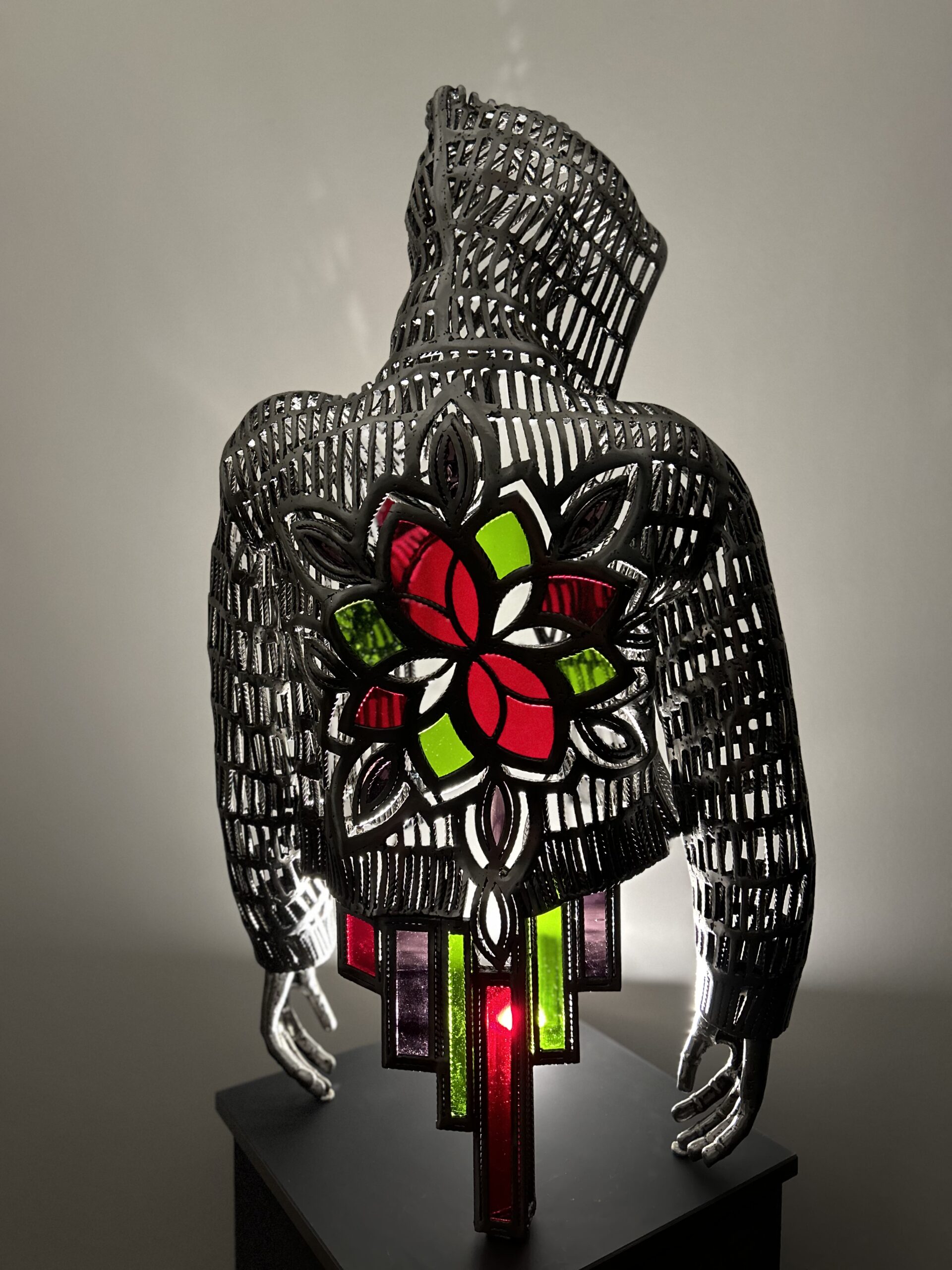 Au début, mes œuvres était exclusivement métalliques, contrastées d’un jeu de finition de la matière, tantôt lisse comme du bronze ou à l’état brut. Très rapidement, l’association du vitrail fût pour moi une évidence.