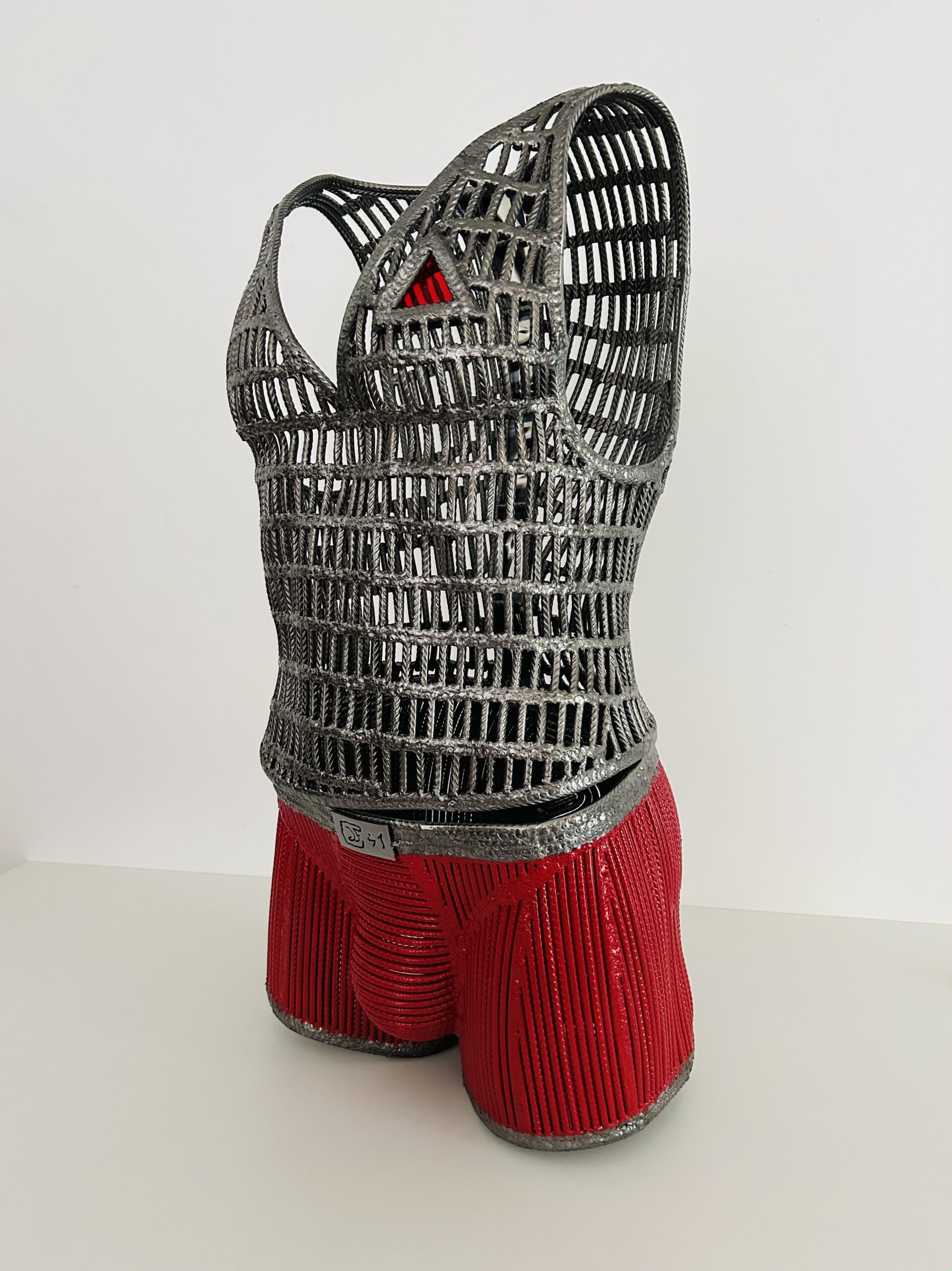 À l’origine, le triangle rouge est né d’une tentative d’intégration du verre au sein d’une sculpture métallique. La première expérimentation, inspirée de la méthode Tiffany et pensée comme un ensemble de type vitrail, s’est révélée être un échec : trop fragile. Lors de la seconde tentative, volontairement plus modeste, j’ai choisi d’intégrer simplement un triangle de verre rouge.
