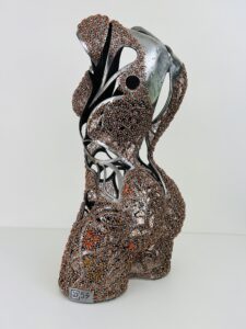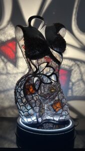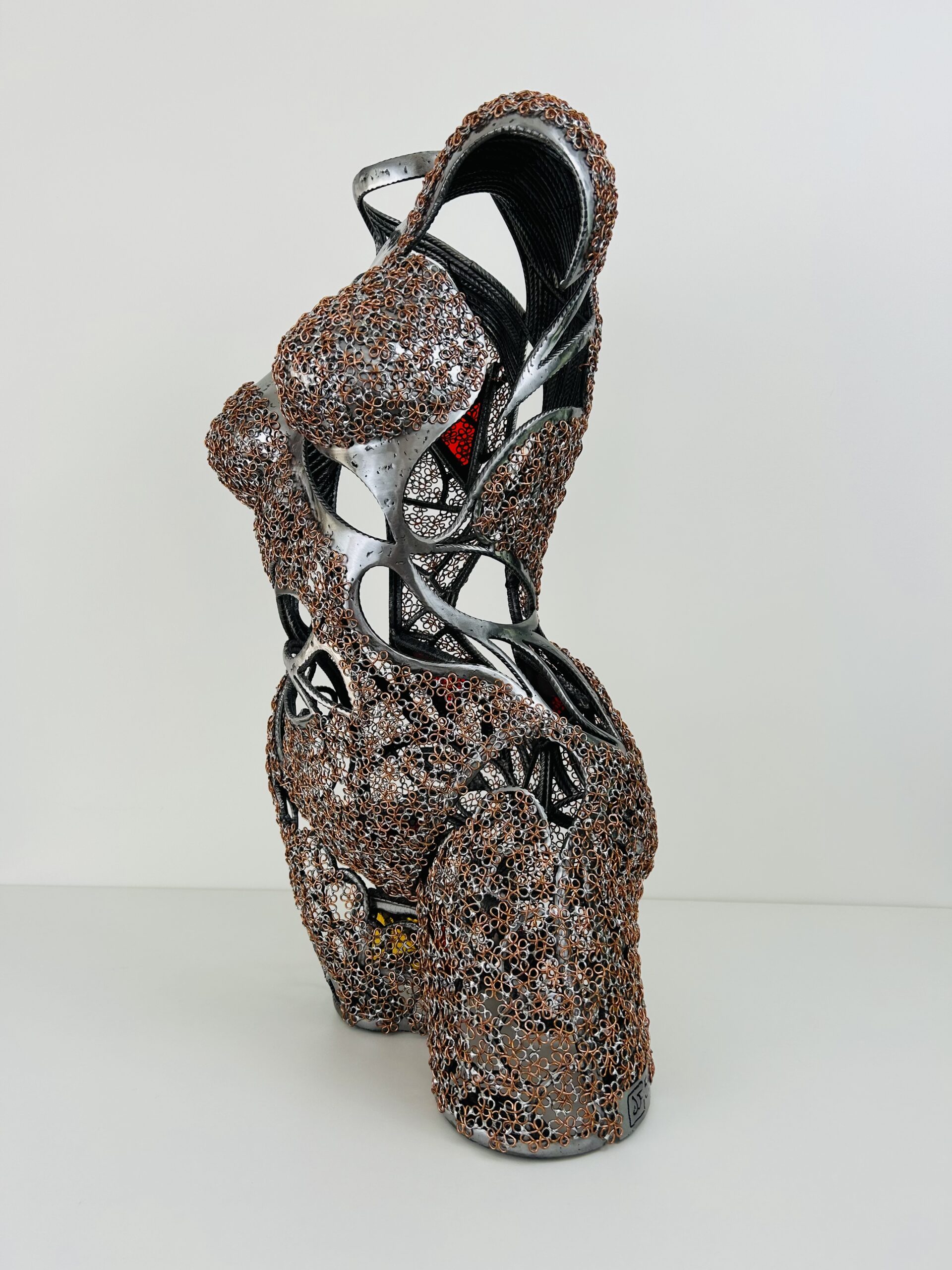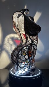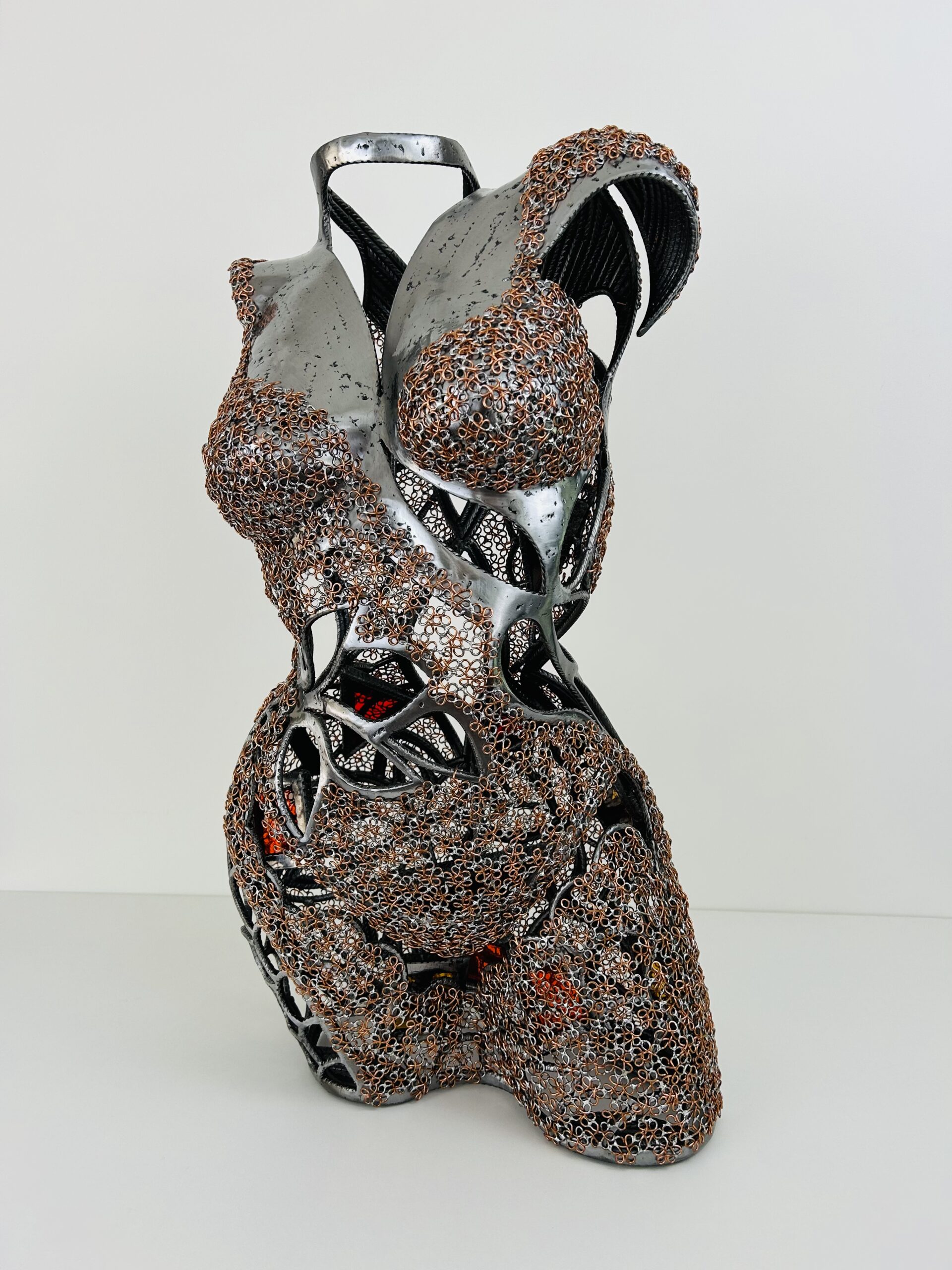 Eloise est un buste de femme habillé d’une robe de cuivre transparente, la dentelle qui la compose est constituée de plus de 900 fleurs de cuivre fait une par une à la main, cela représente à peu près 3000 soudures à l’étain
