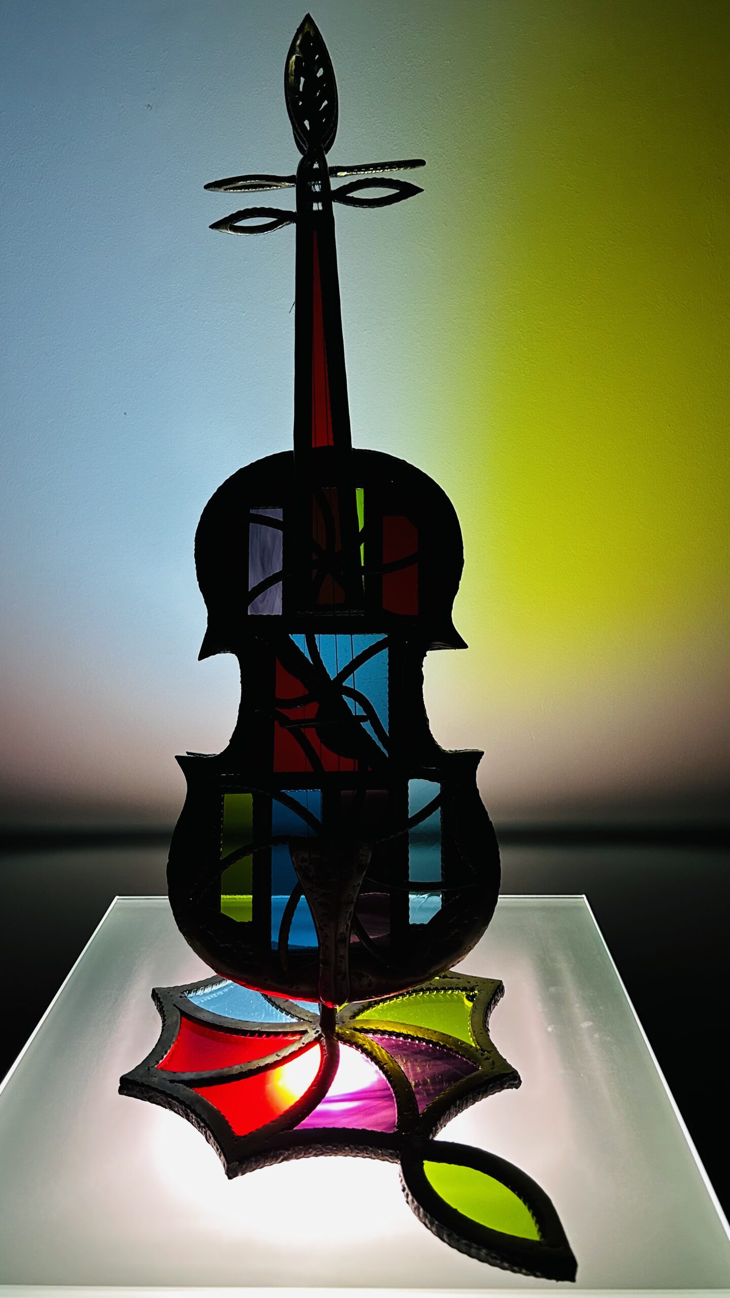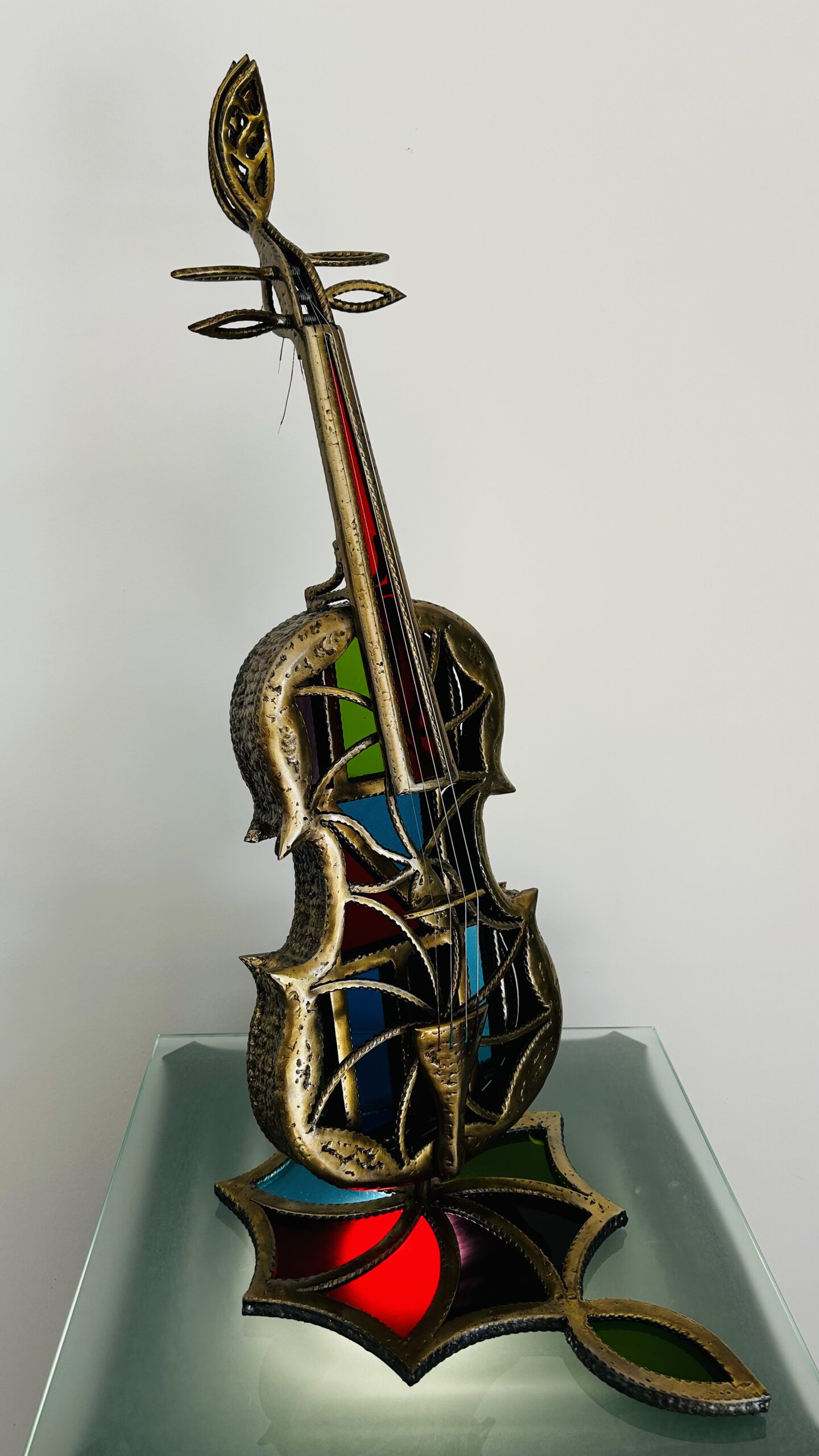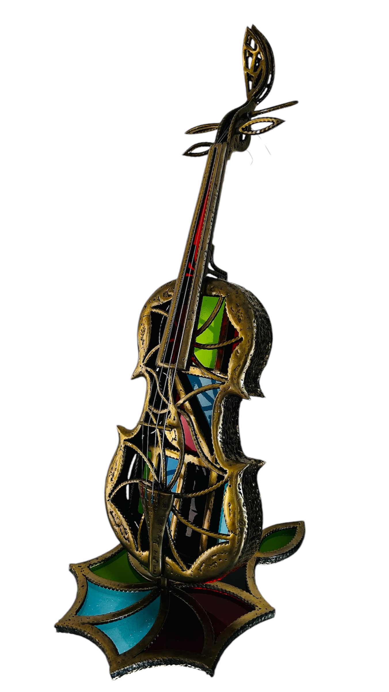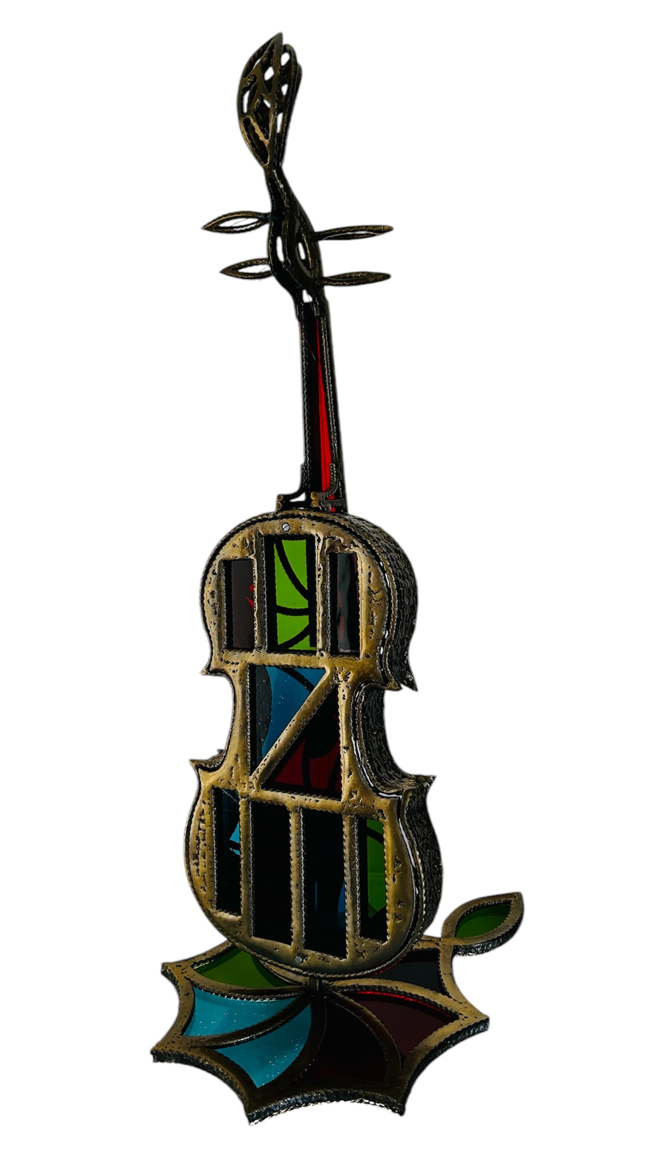 Le socle est composé de 9 pièces de vitrail, celui ci est en harmonie parfaite avec l’instrument, la couleur finale de l’ensemble est doré par technique de laitonnage, 3 couches de vernis terminent la finition de l’œuvre.