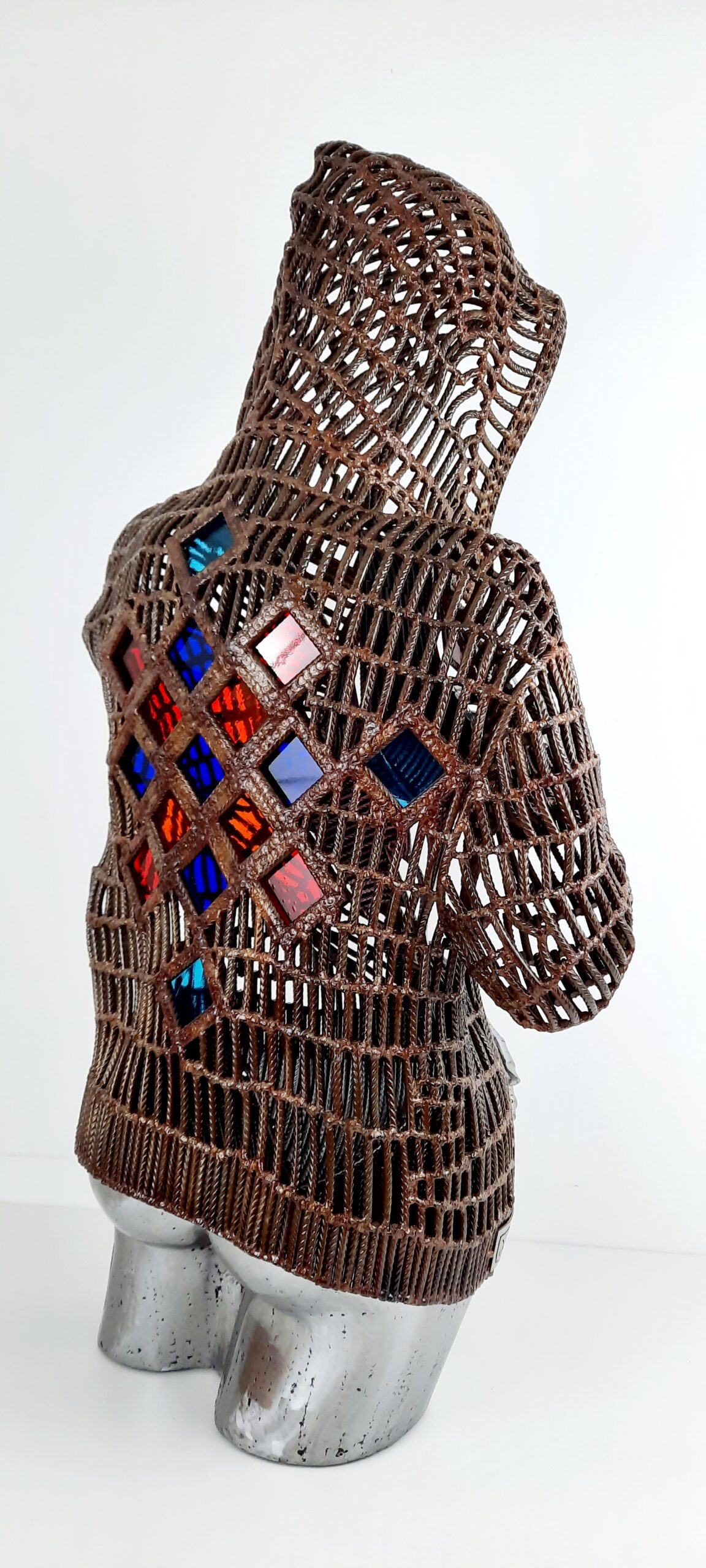 17 pièces de vitrail laissent apparaître dans le dos un motif arlequin, 2 autres triangles sont présent sur le devant du blouson et à l’arrière de la jambe gauche.