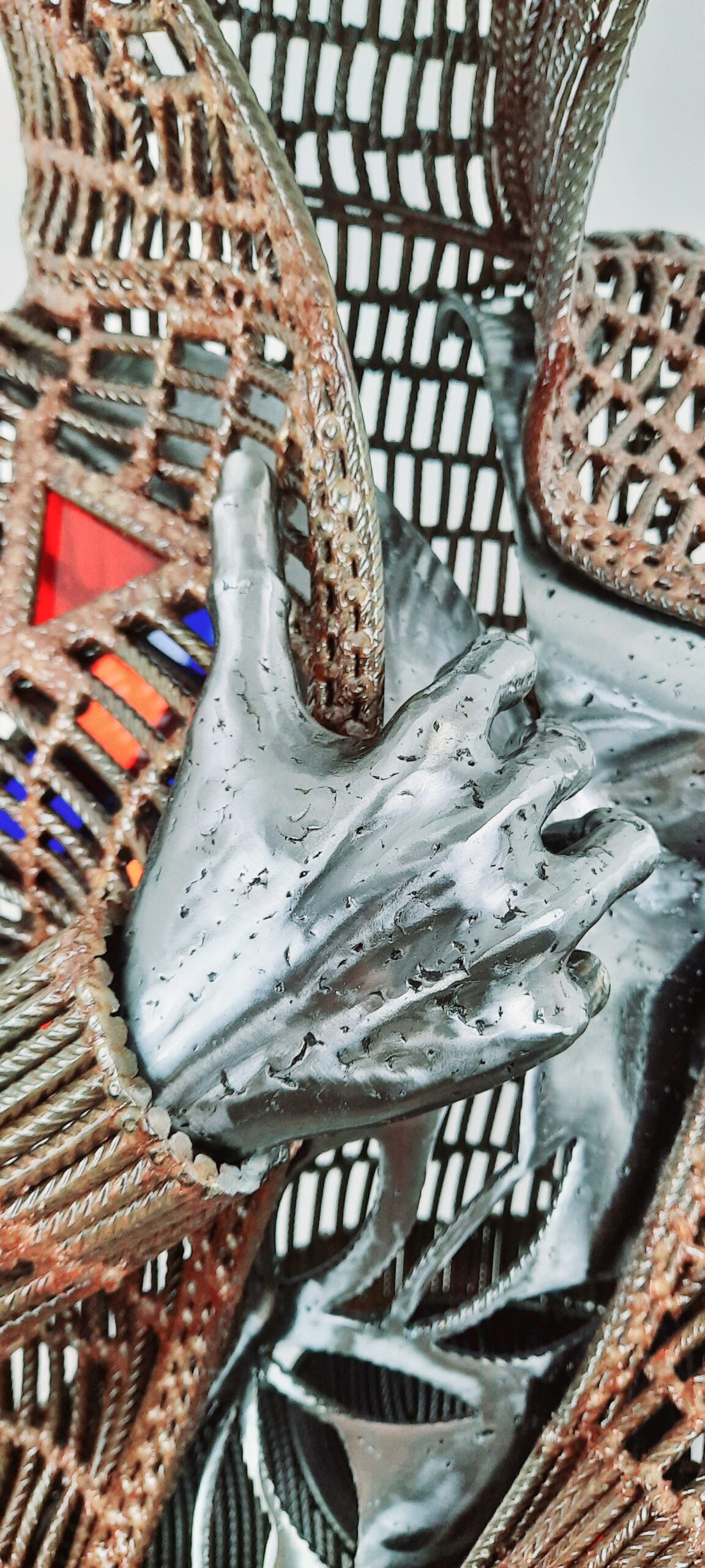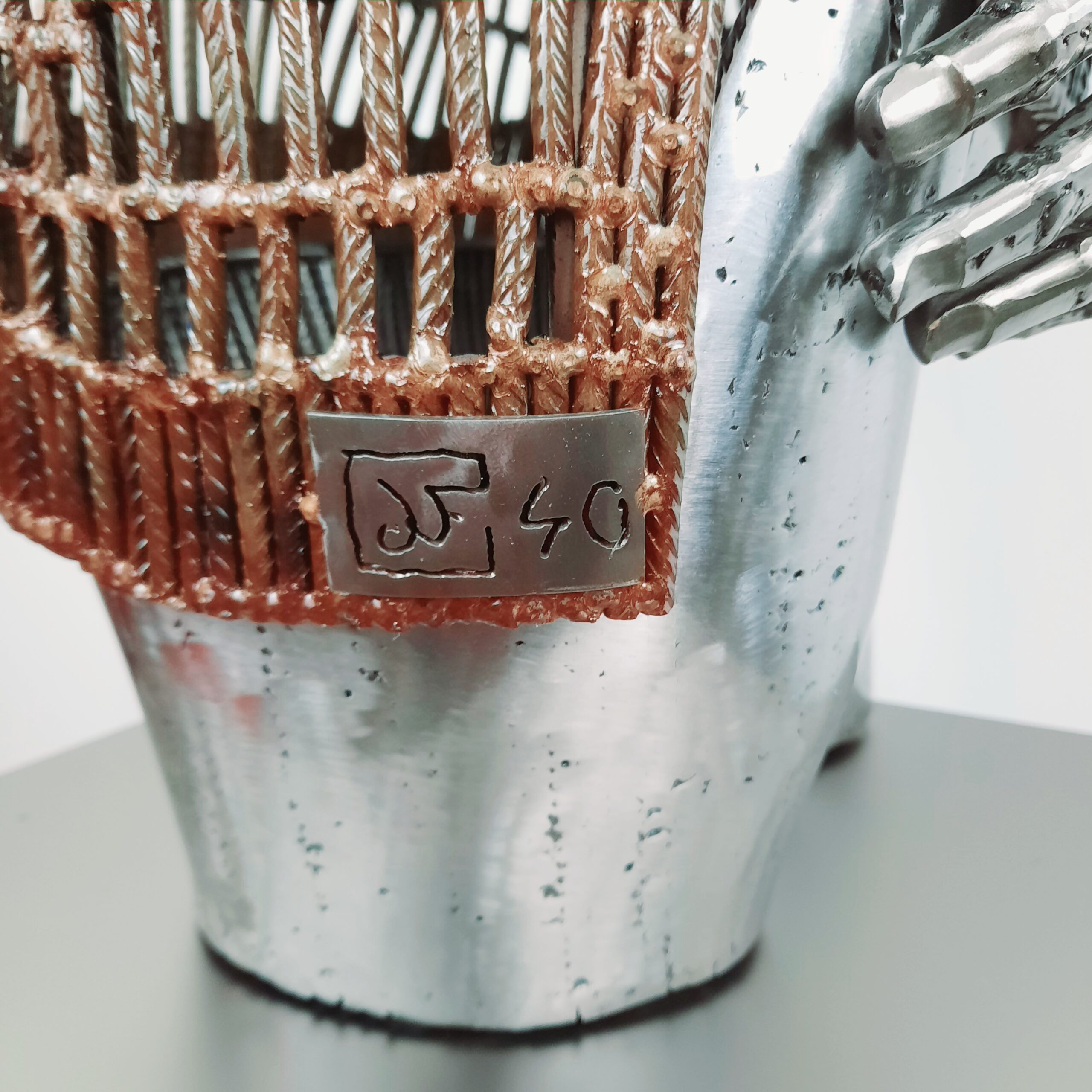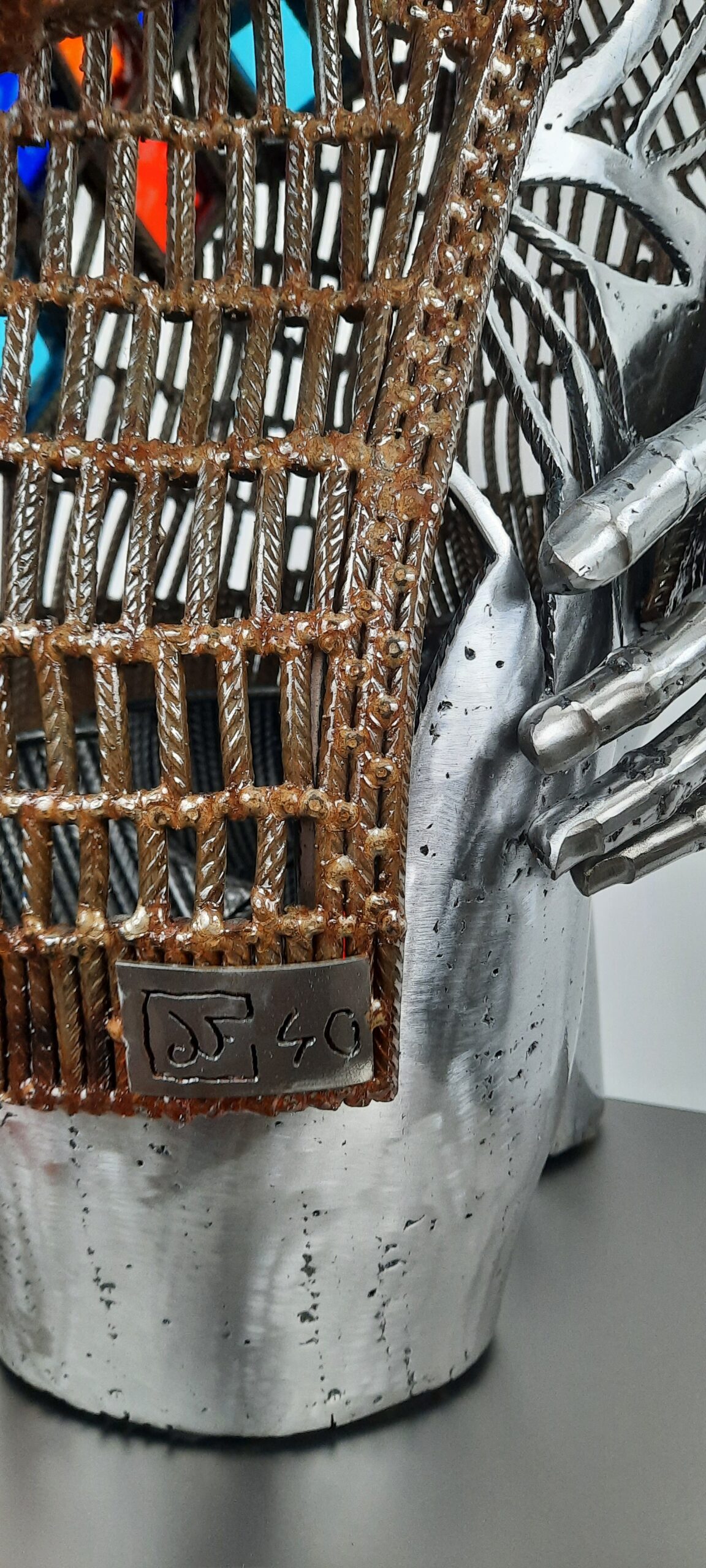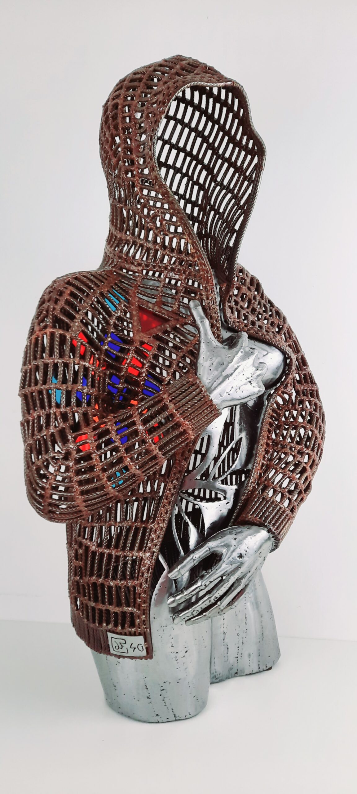 Cette sculpture est réalisée exclusivement à partir de fer à béton, le blouson rouillé et vernis donne un aspect cuir ciré, le corps quand à lui est polis vernis.