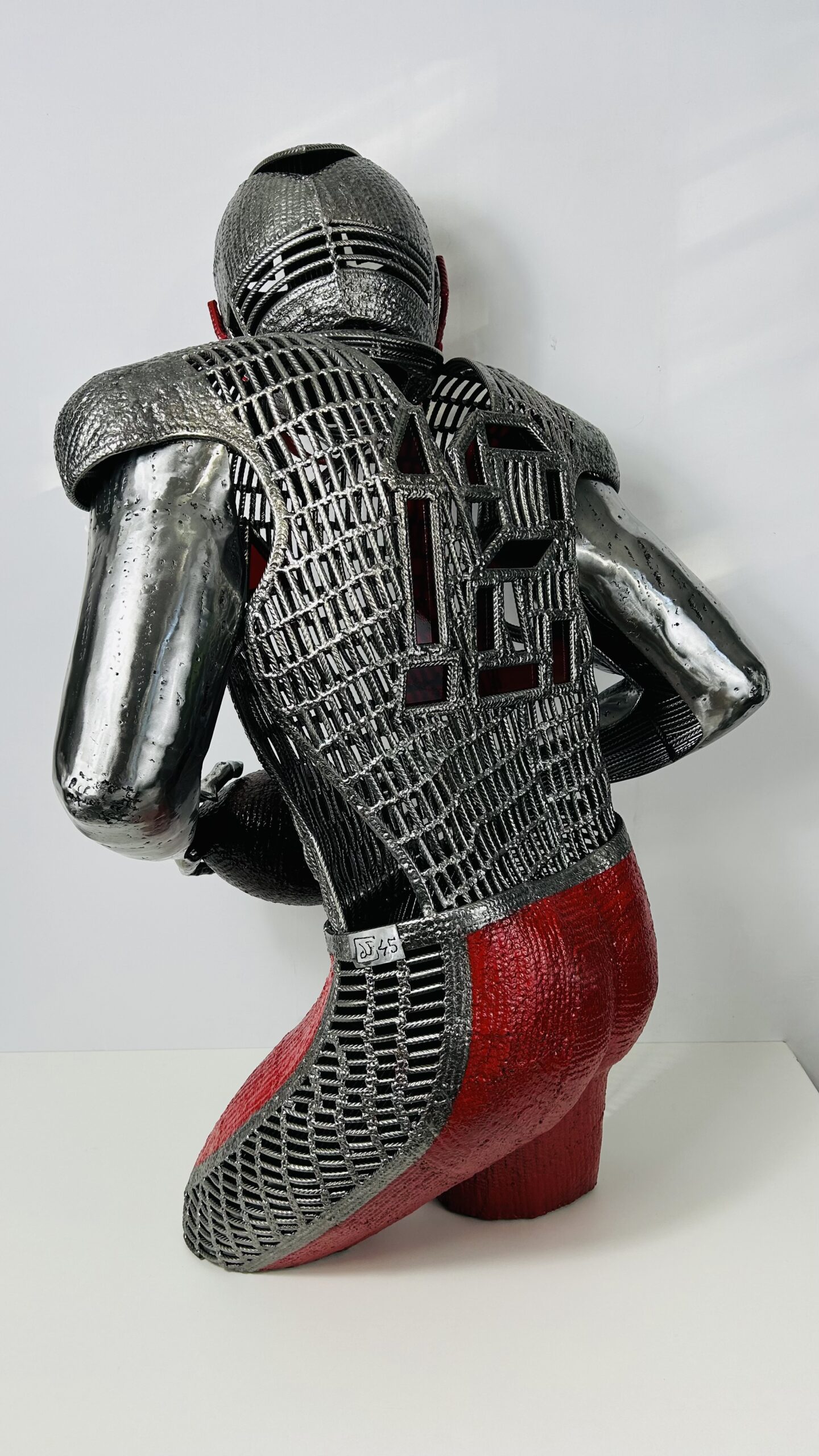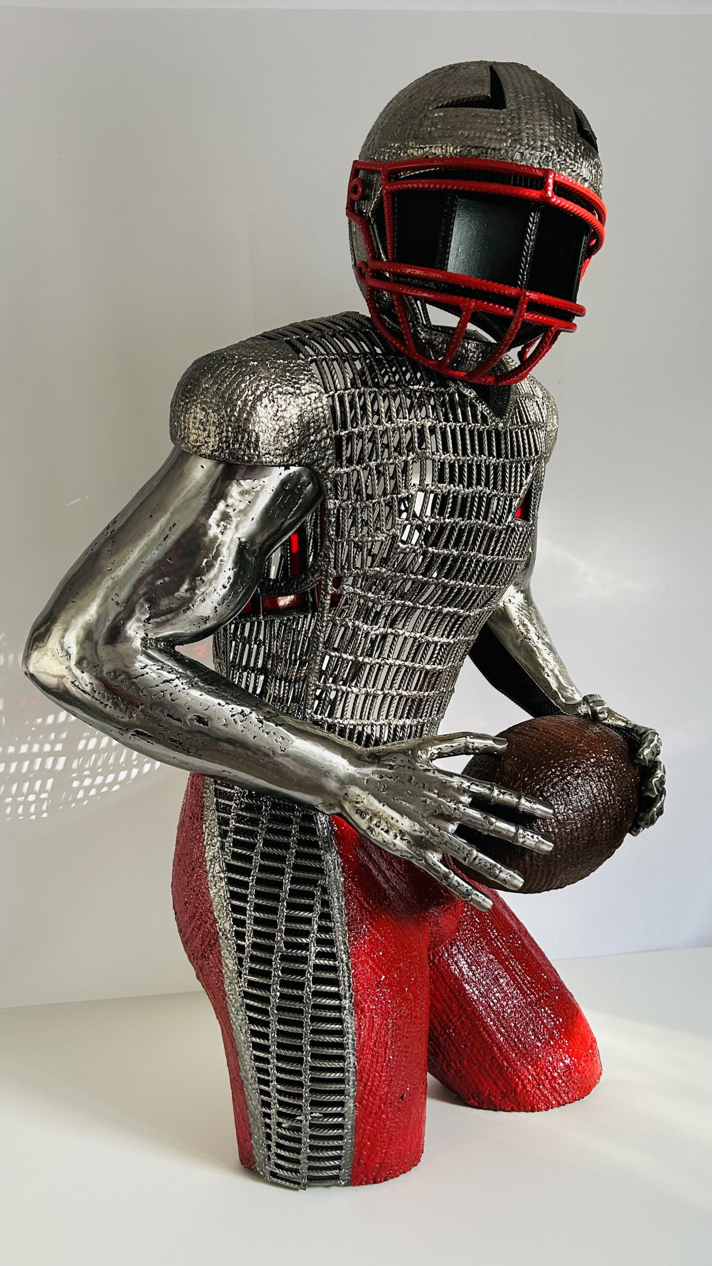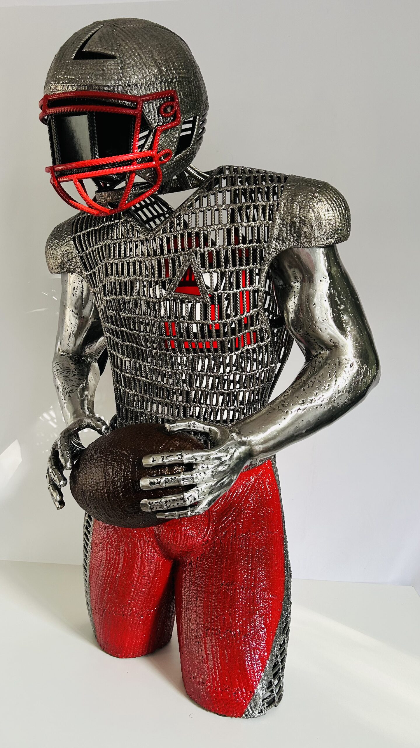 Cette sculpture est exclusivement réalisée à partir de fer à béton et de vitrail , du verre rouge pour le douze dans le dos et comme sur toutes mes sculptures un triangle rouge apparaît fièrement sur le torse du joueur.