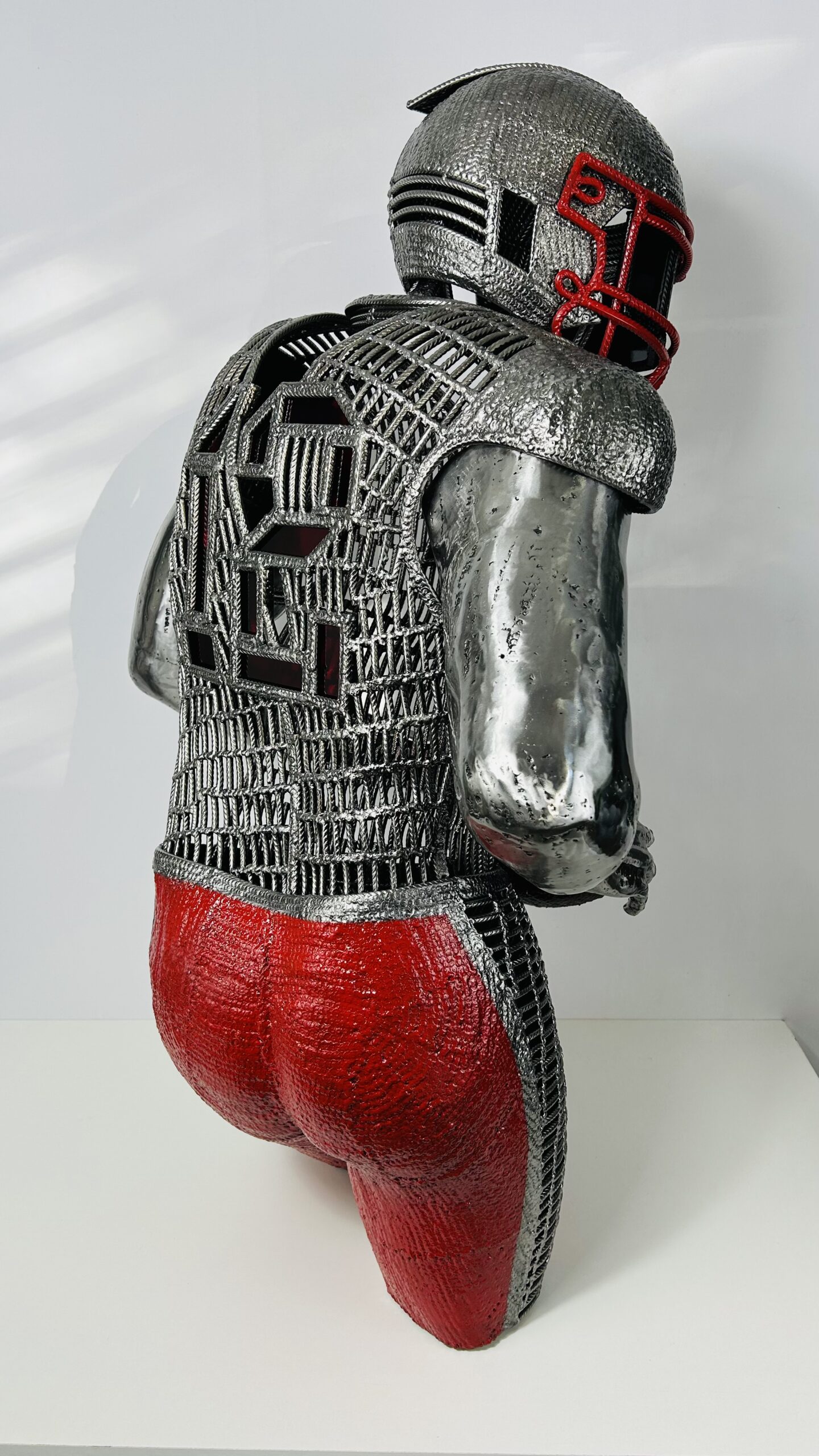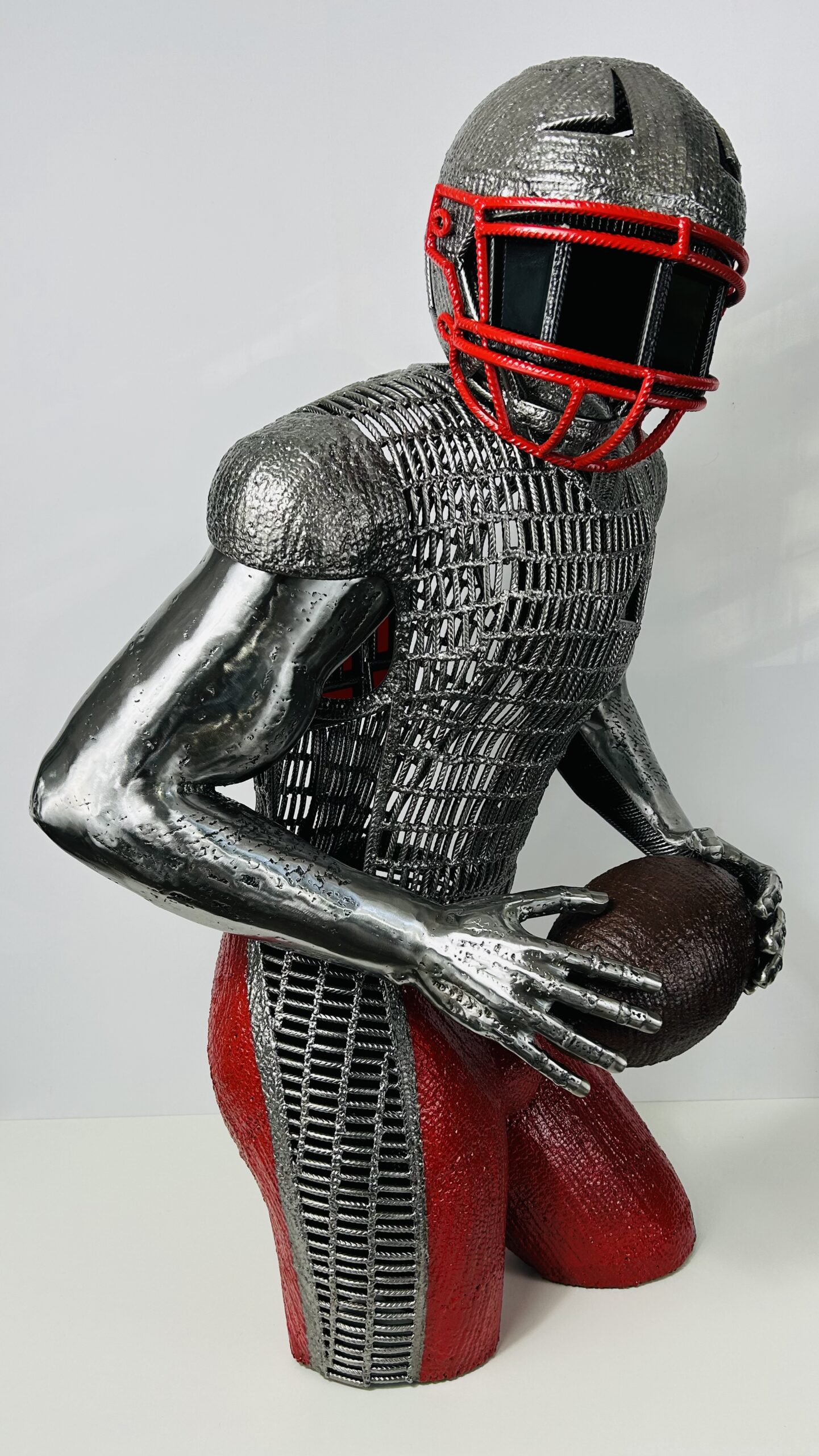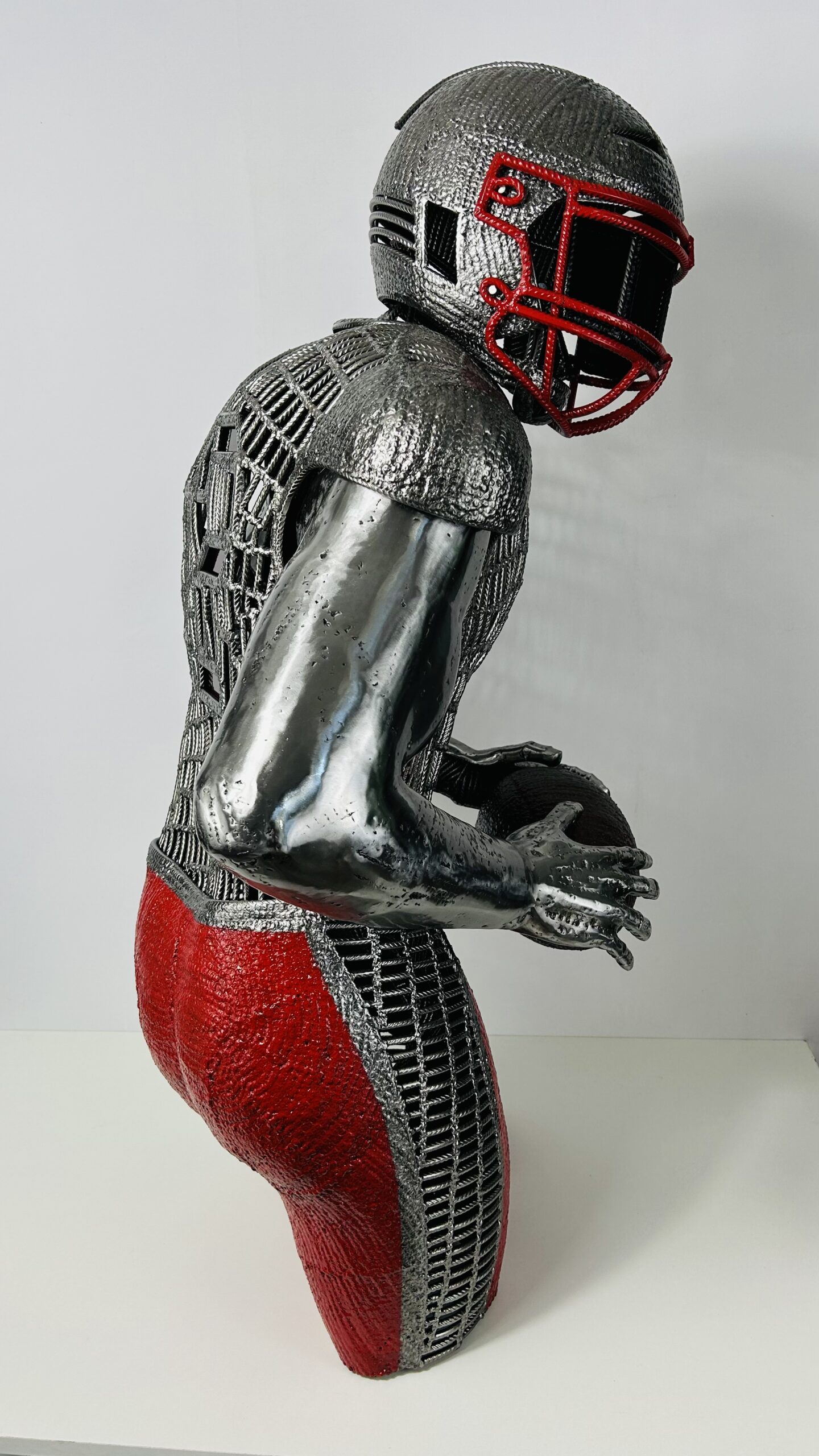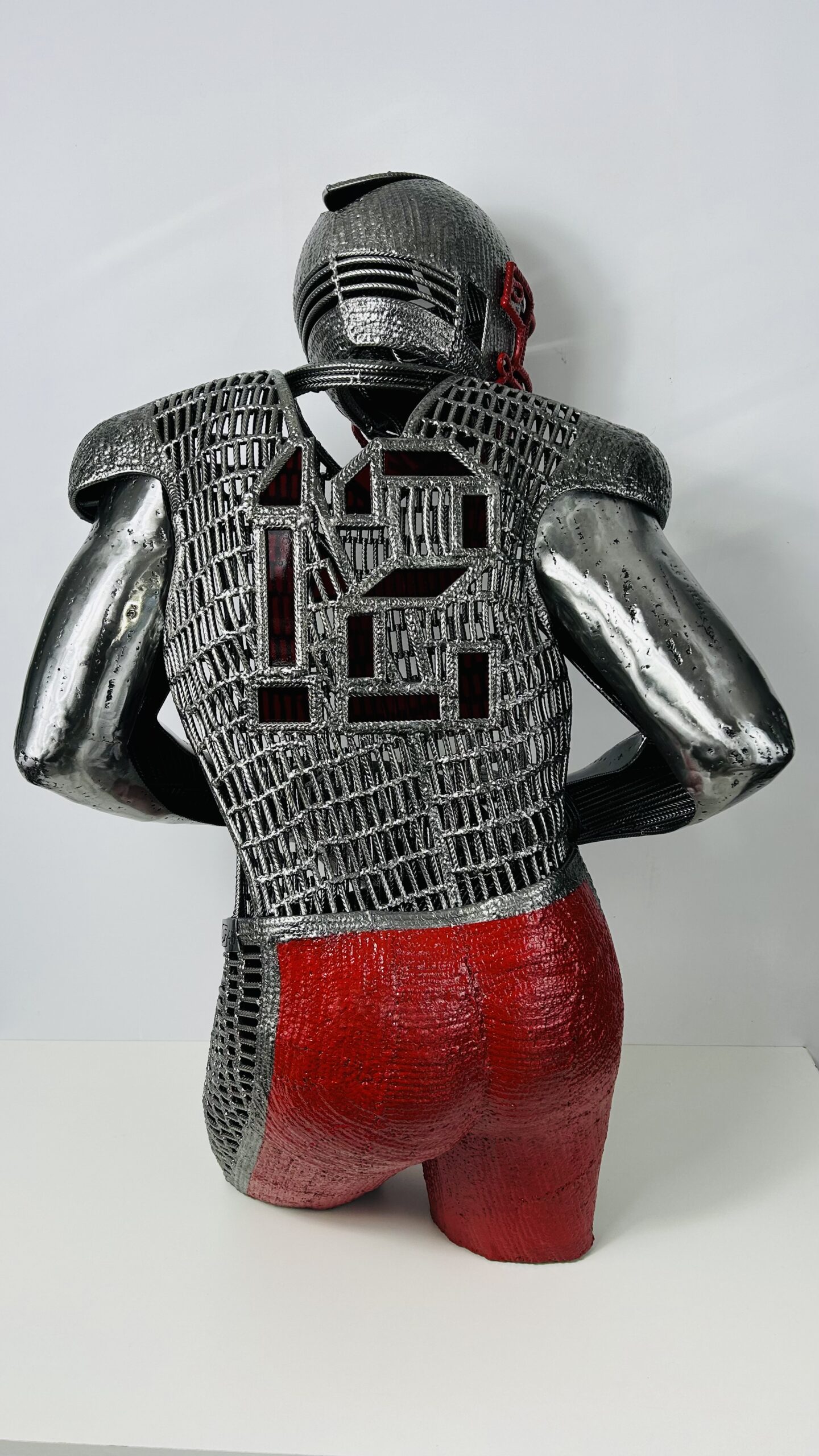 Cette sculpture est exclusivement réalisée à partir de fer à béton et de vitrail , du verre rouge pour le douze dans le dos et comme sur toutes mes sculptures un triangle rouge apparaît fièrement sur le torse du joueur.