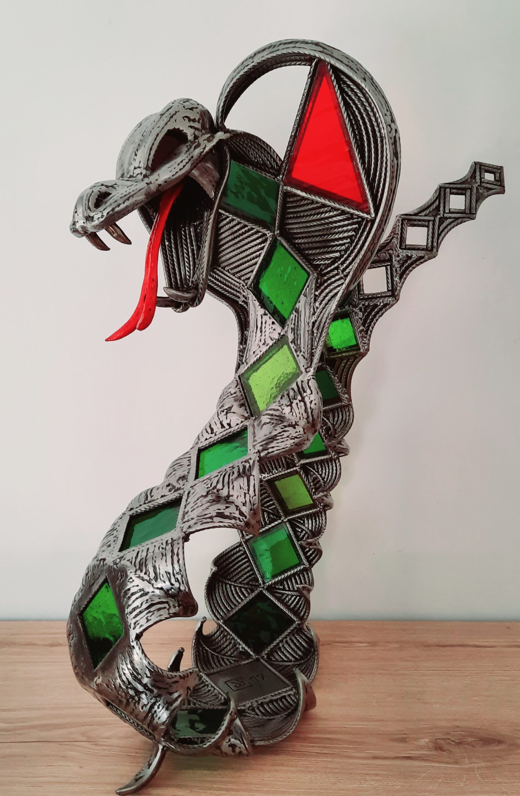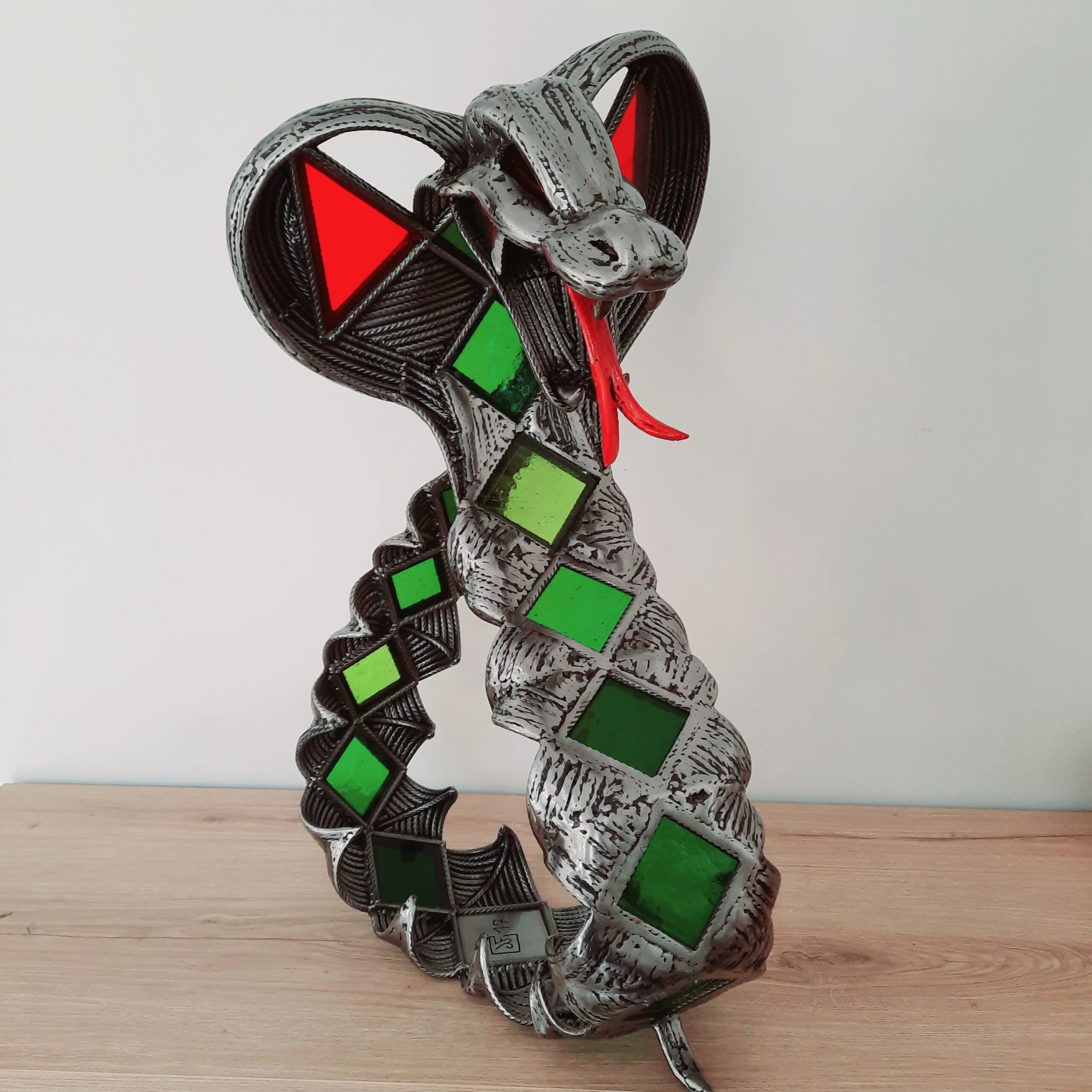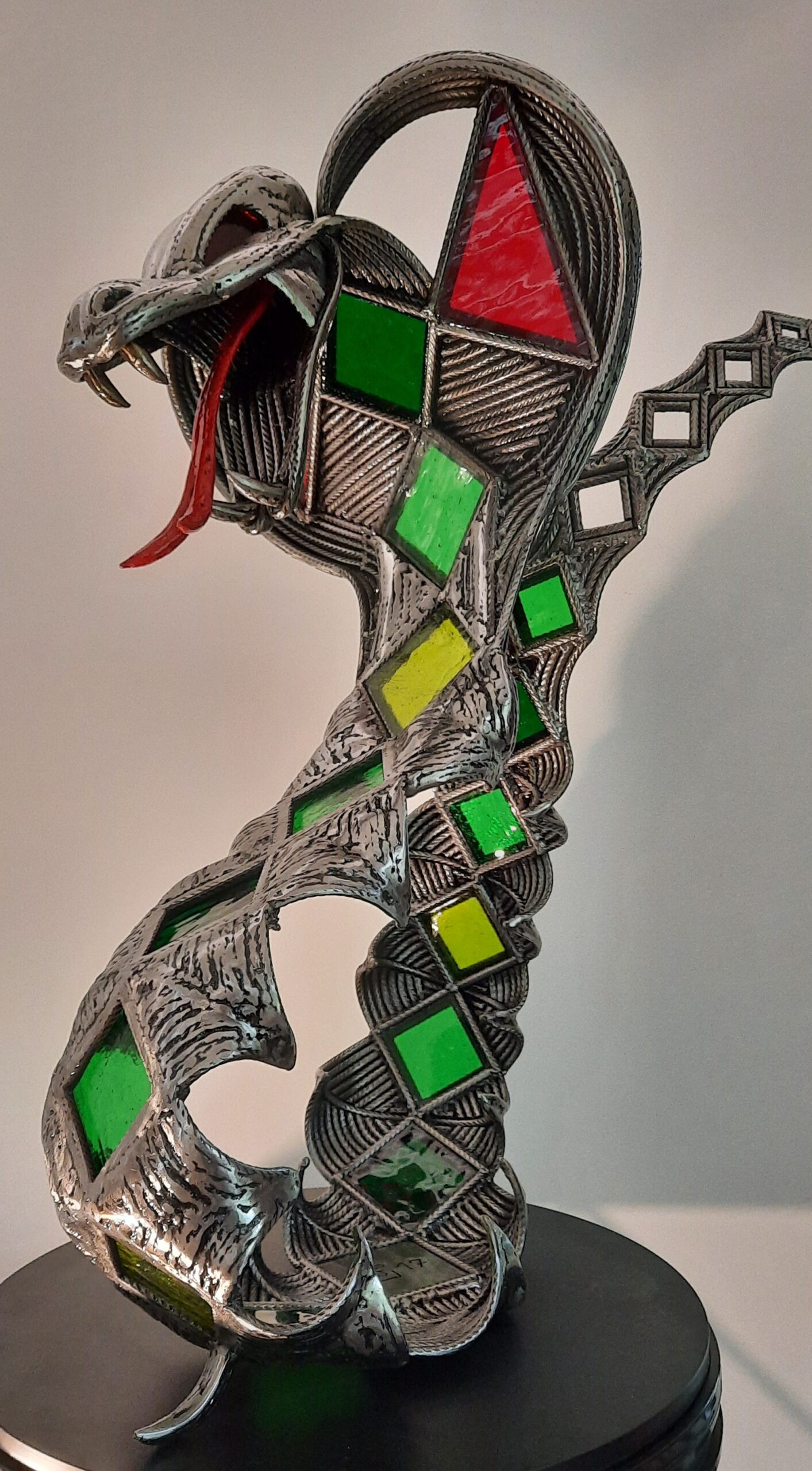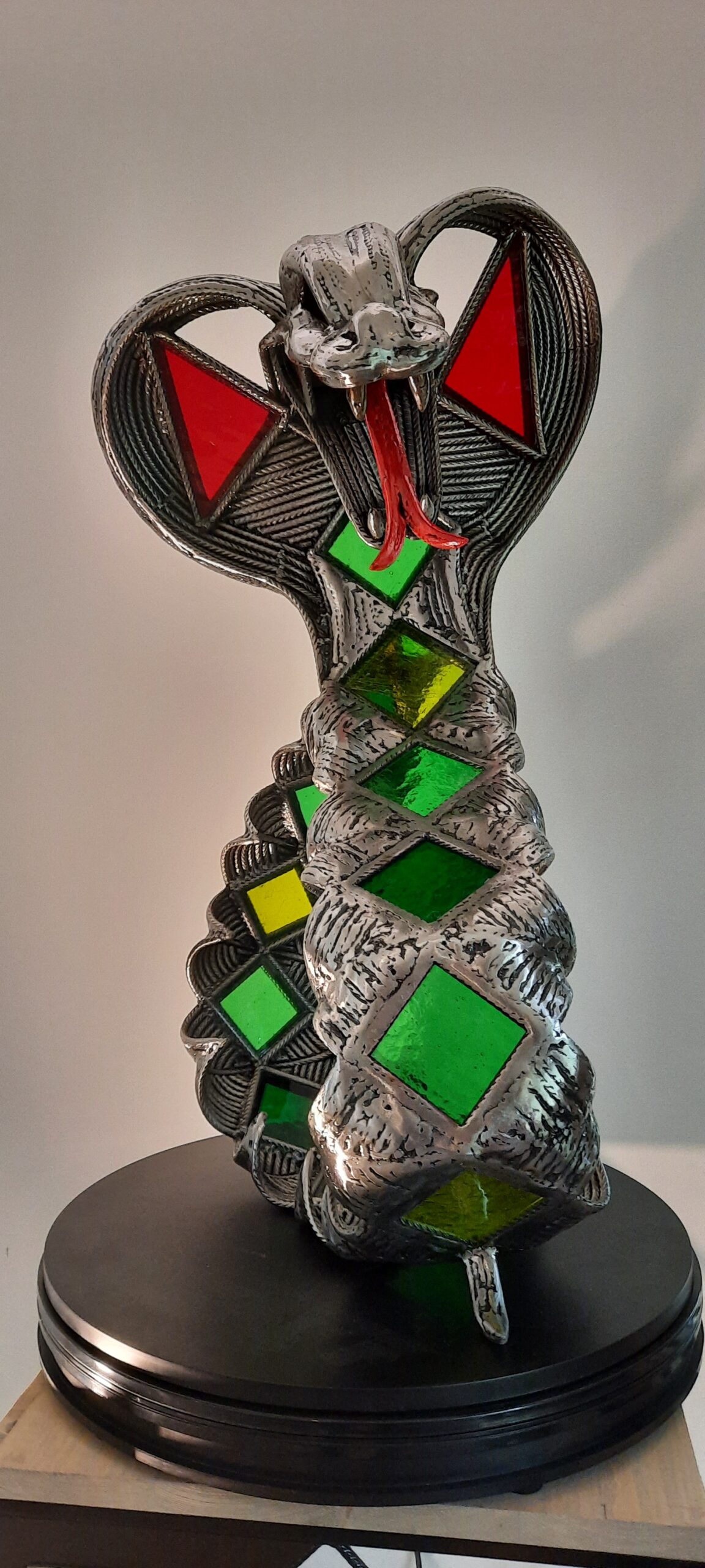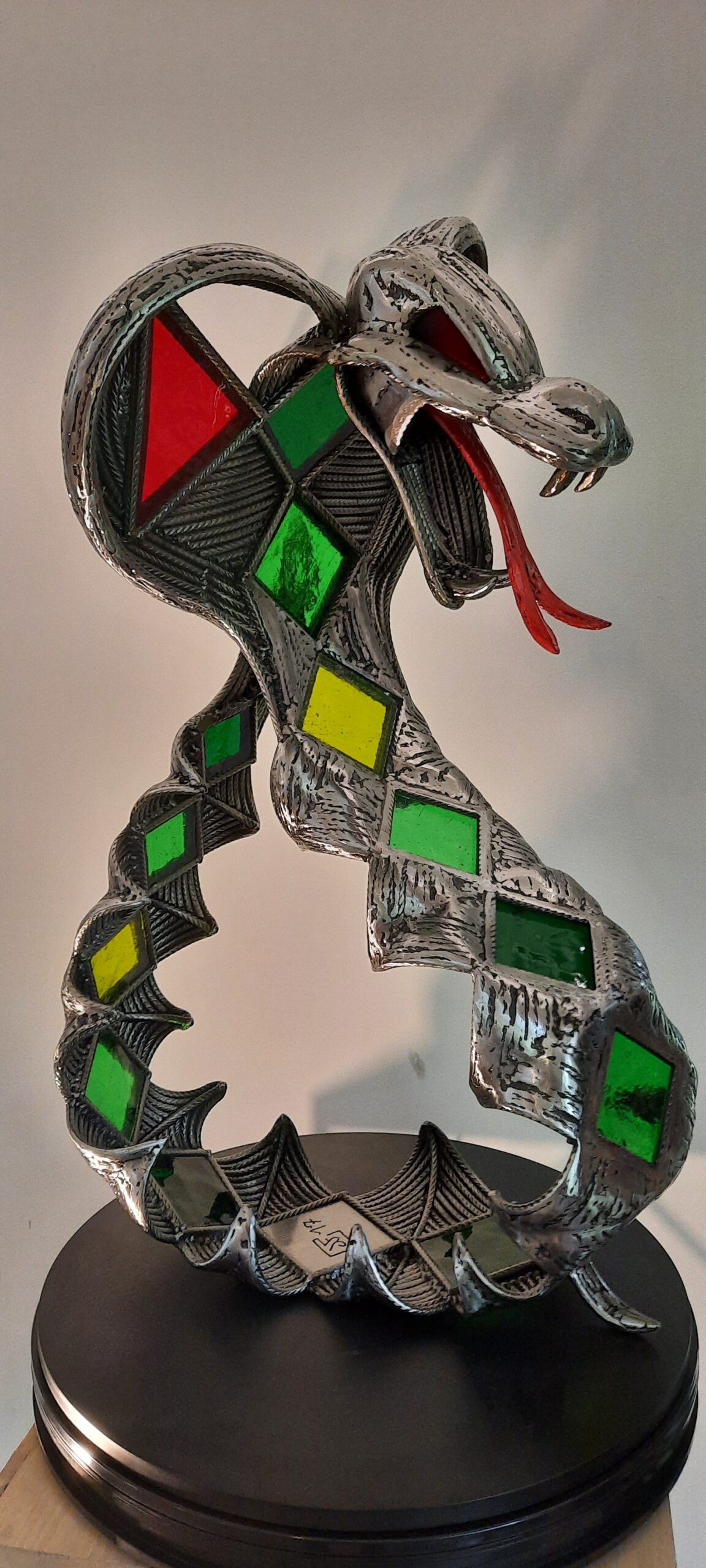 En fait, je venais de réalisée luminescence , et sa dorsale de vitrail me faisait penser une fois terminée, à des écailles de serpent. Le Cobra serait l’animal parfait pour cela.
