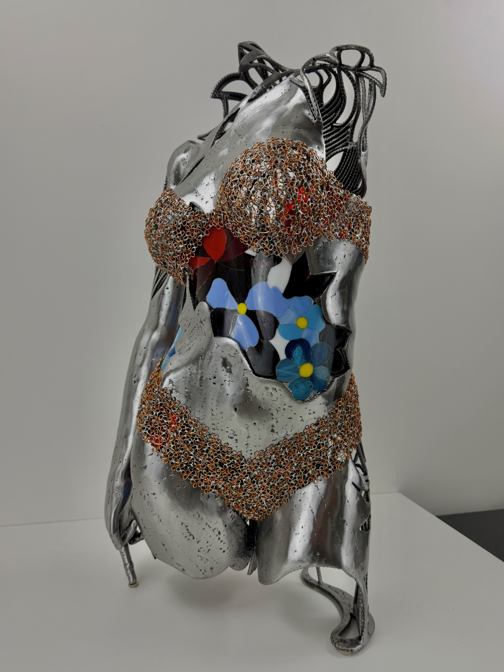 L’intérieur de la sculpture est enrichi de vitrail, dont les couleurs lumineuses créent un jeu de lumière captivant lorsque l’œuvre est éclairée. Les fragments colorés apportent douceur et poésie, contrastant avec l’aspect industriel du métal.