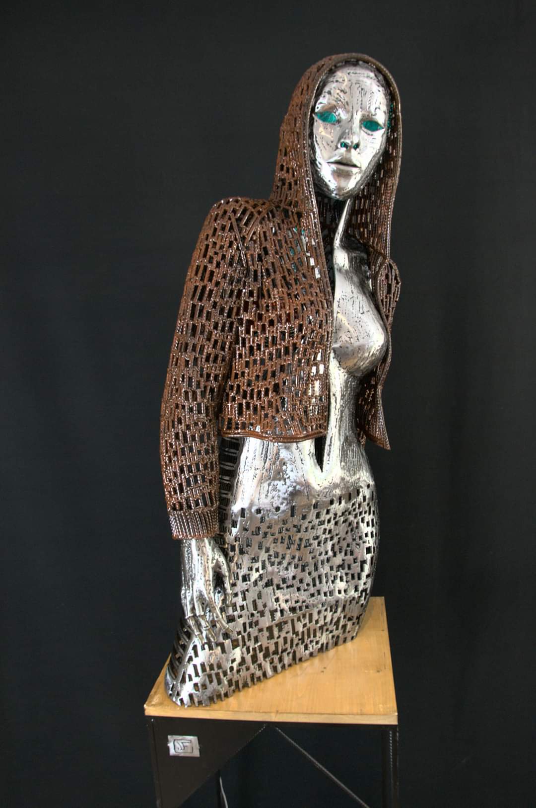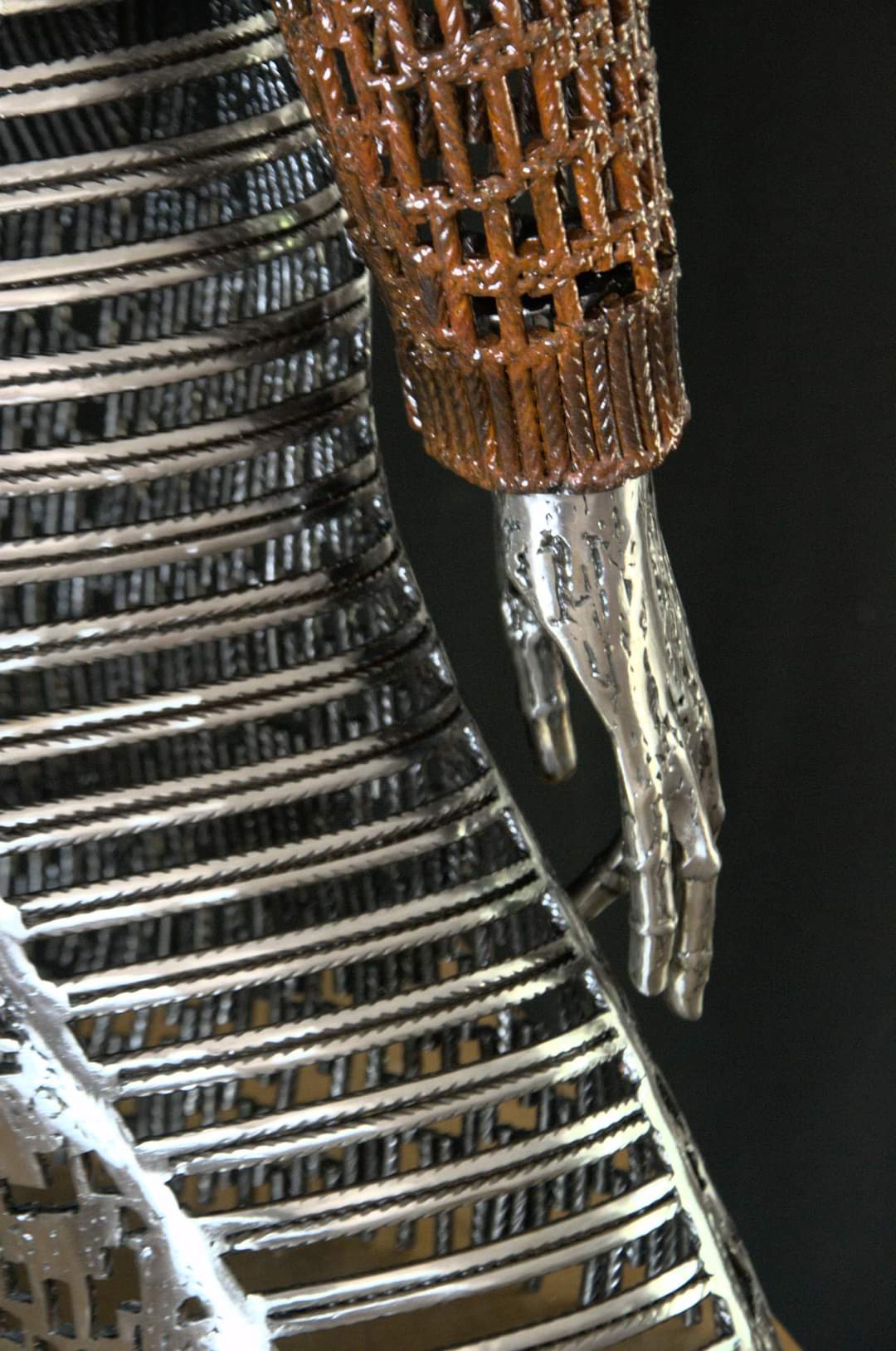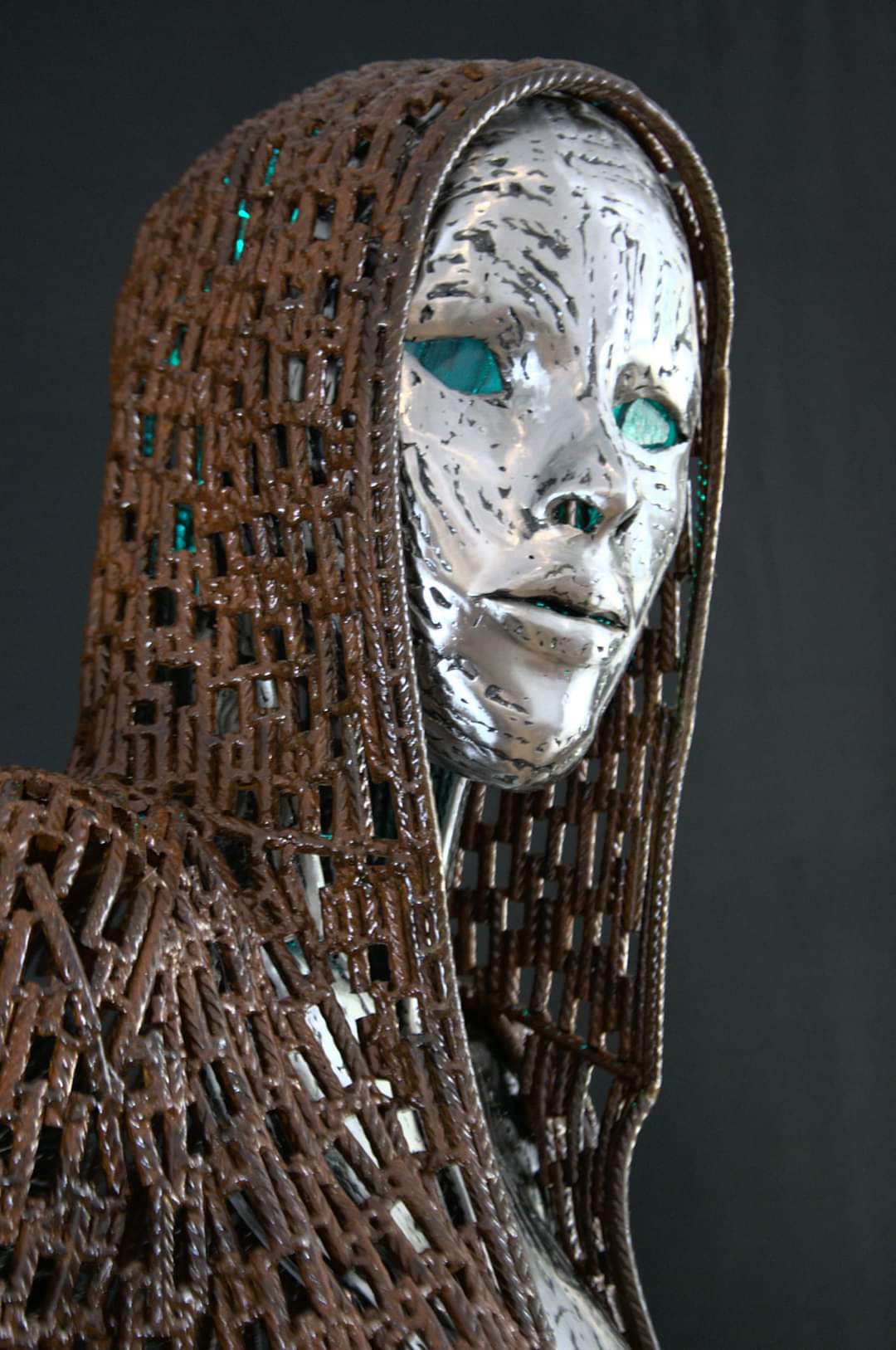 Métallica est réalisée à partir de à 98% de fer à béton, où son équilibre trouve sa source dans la proportion des vides et de sa transparence ….. Les 2% de verre à vitrail marquent la profondeur de son regard captivant.