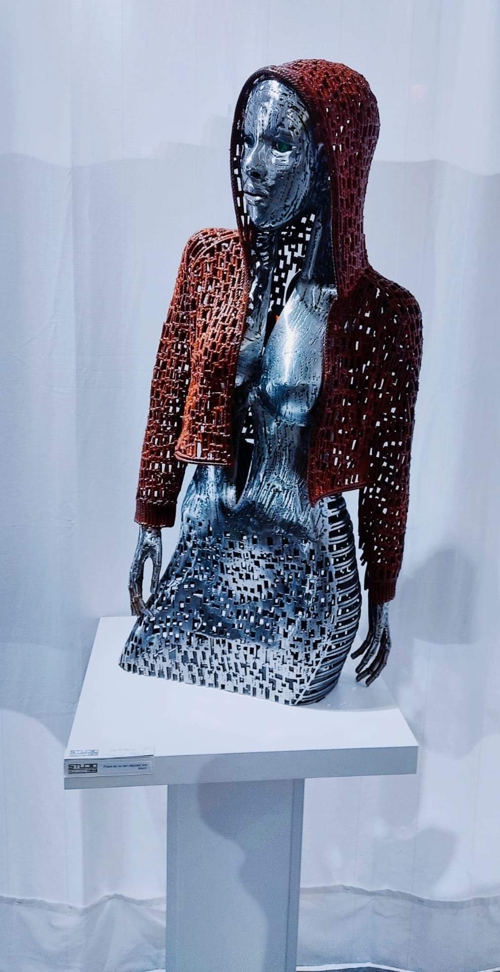 Cette œuvre est l’assemblage de 2 sculptures : 1 pour la robe, le buste et la tête; et 1 pour le blouson.
