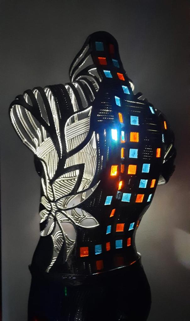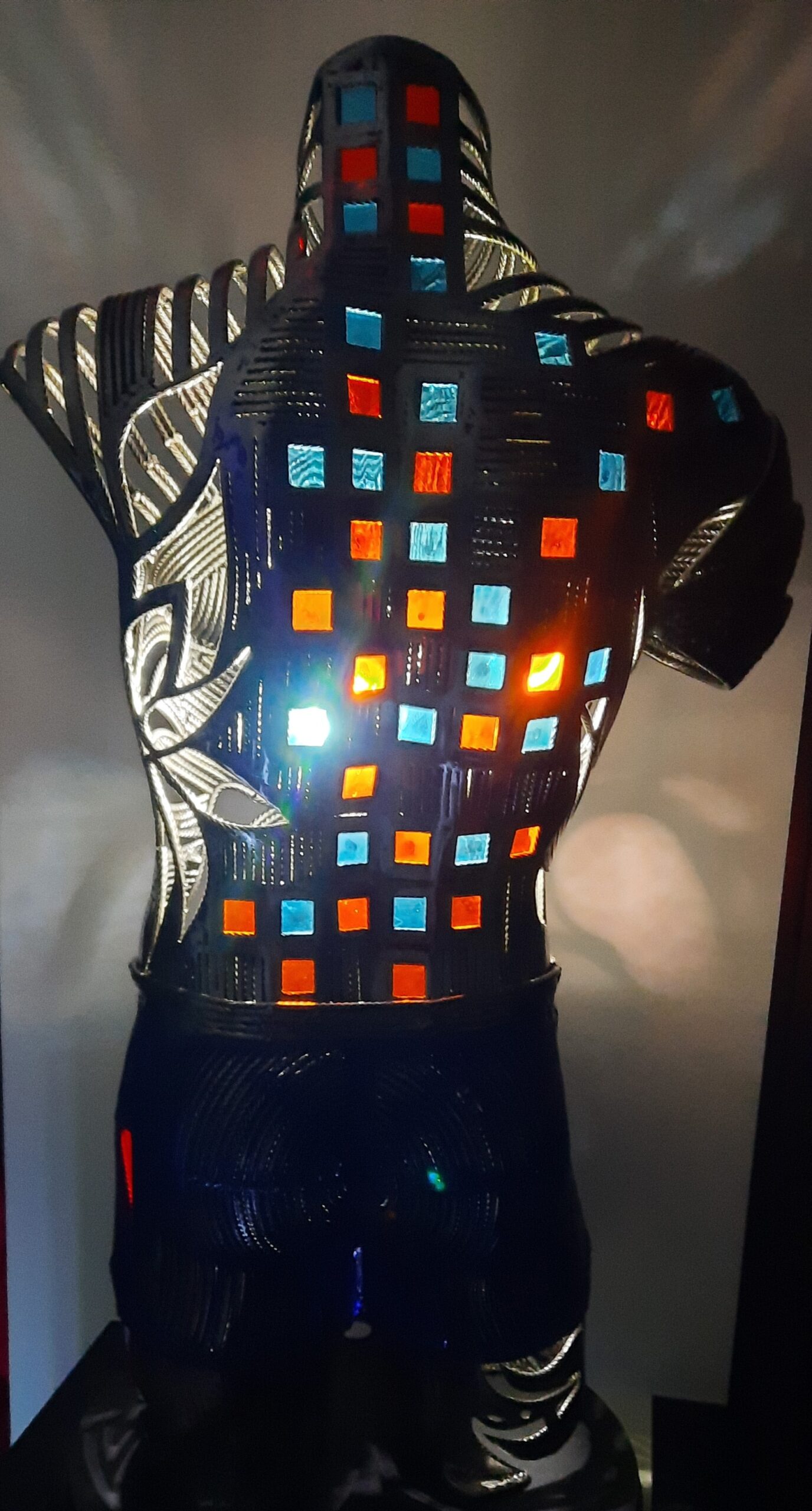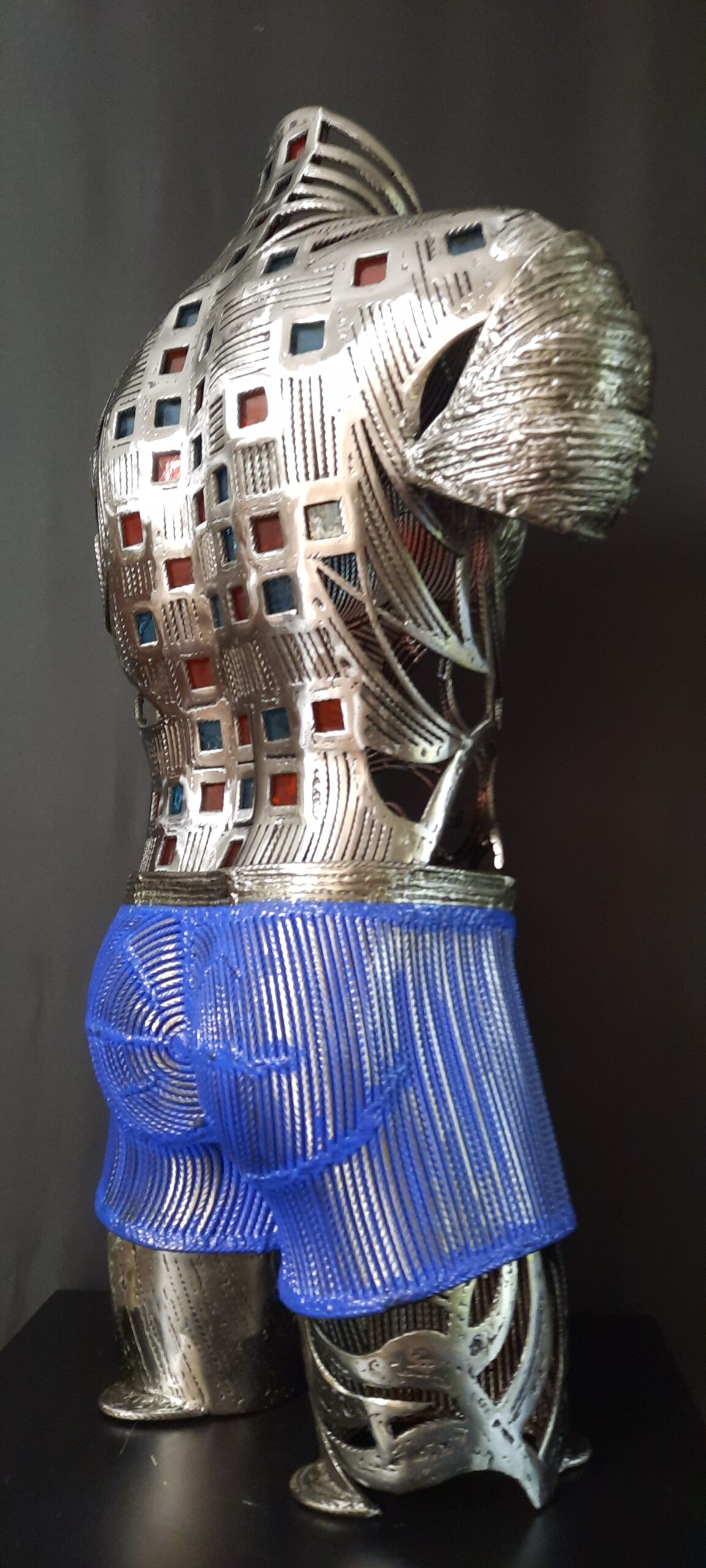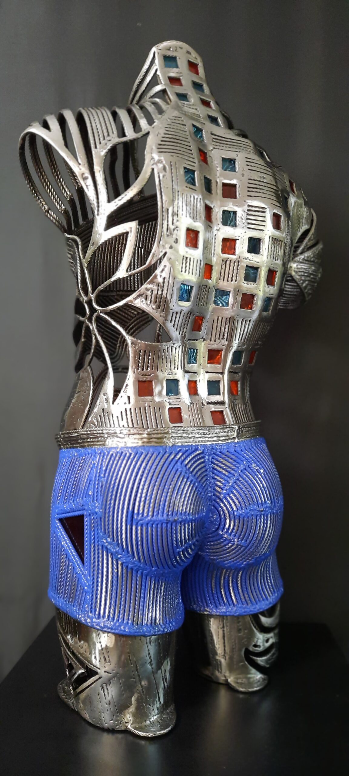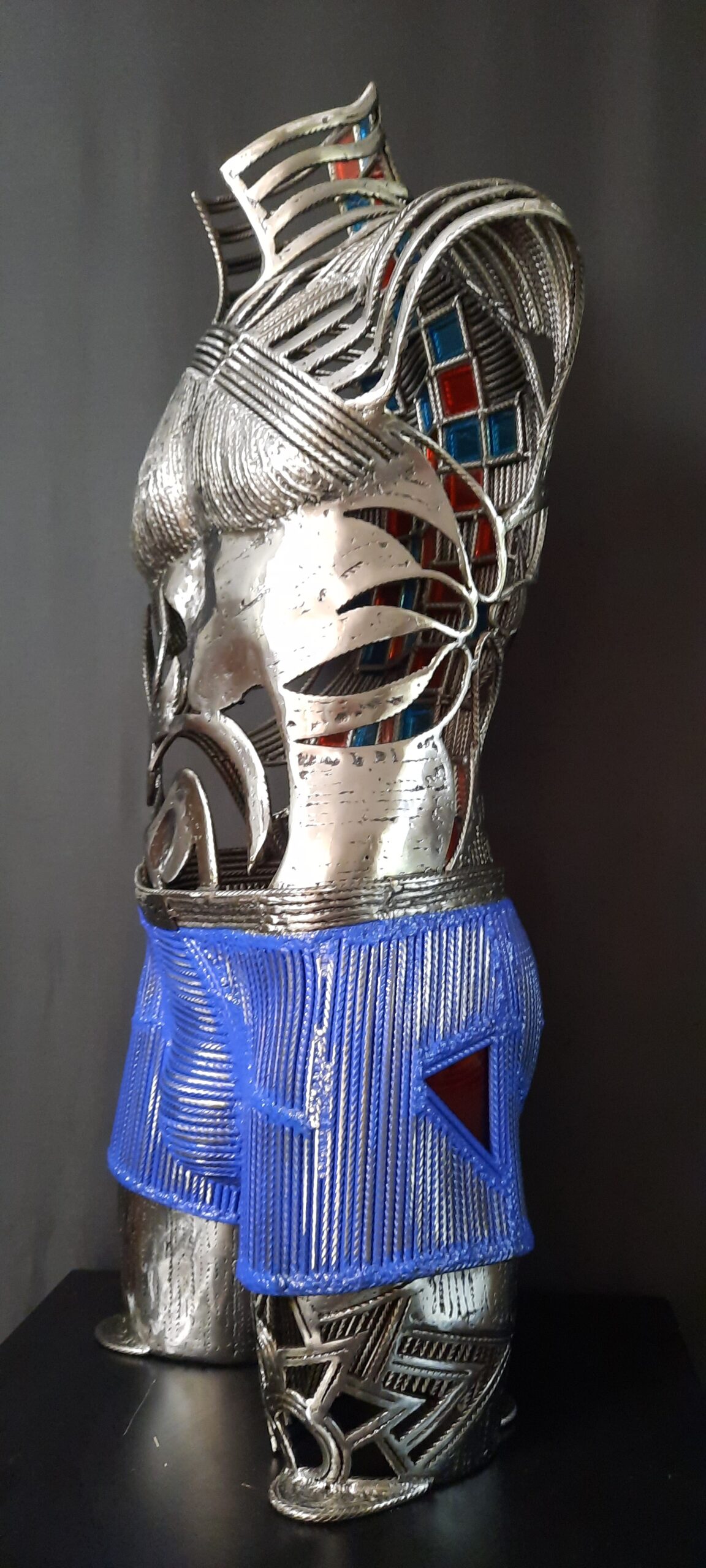 Le buste fait référence à l’homme gladiateur, parait d’une armure d’épaule; tandis que la peau du buste s’anime de tatouages modernes. Le caleçon caractérise le 21ème siècle, avec un bleu « Marjorel » en référence à Yves Saint Laurent, un homme au service de l’émancipation des femmes, par la mode.