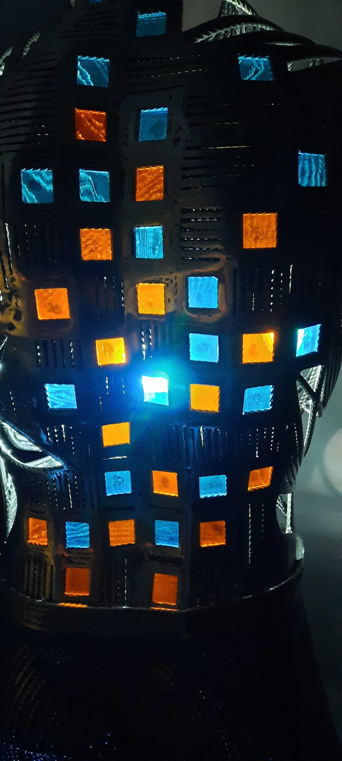 Cette sculpture est réalisée exclusivement à partir de barre de fer à béton et de verres à vitrail. Le dos est orné de 42 carrés de pièces de vitrail bleu et orange.