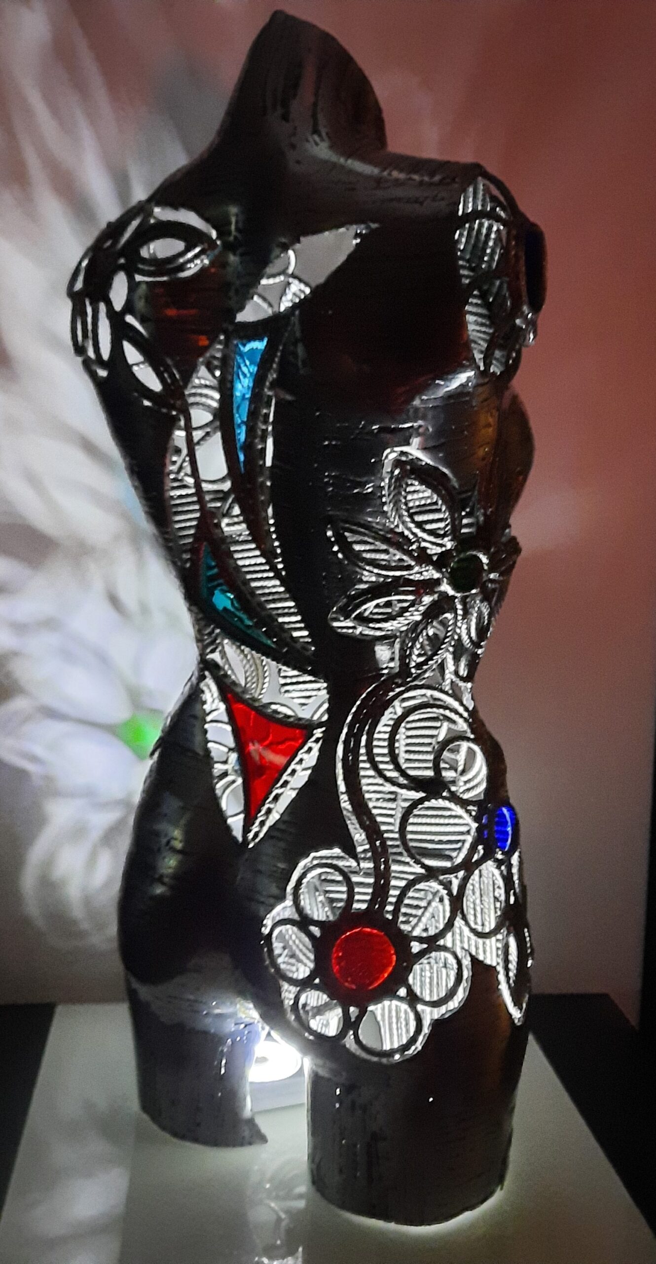 L’inspiration du départ pour cette réalisation était de mettre à l’honneur le tatouage féminin : réaliser un buste de femme avec des parties ajourées et colorées. Des tatouages non superficiels, mais incrustés, qui collent littéralement à la peau.