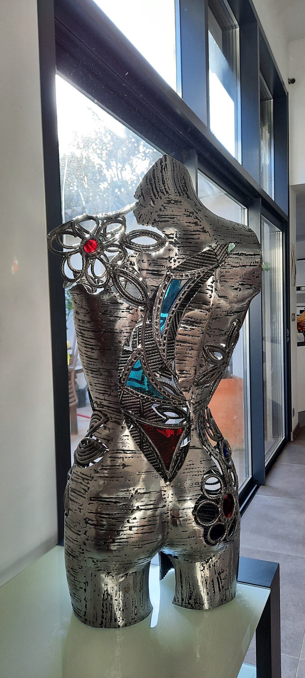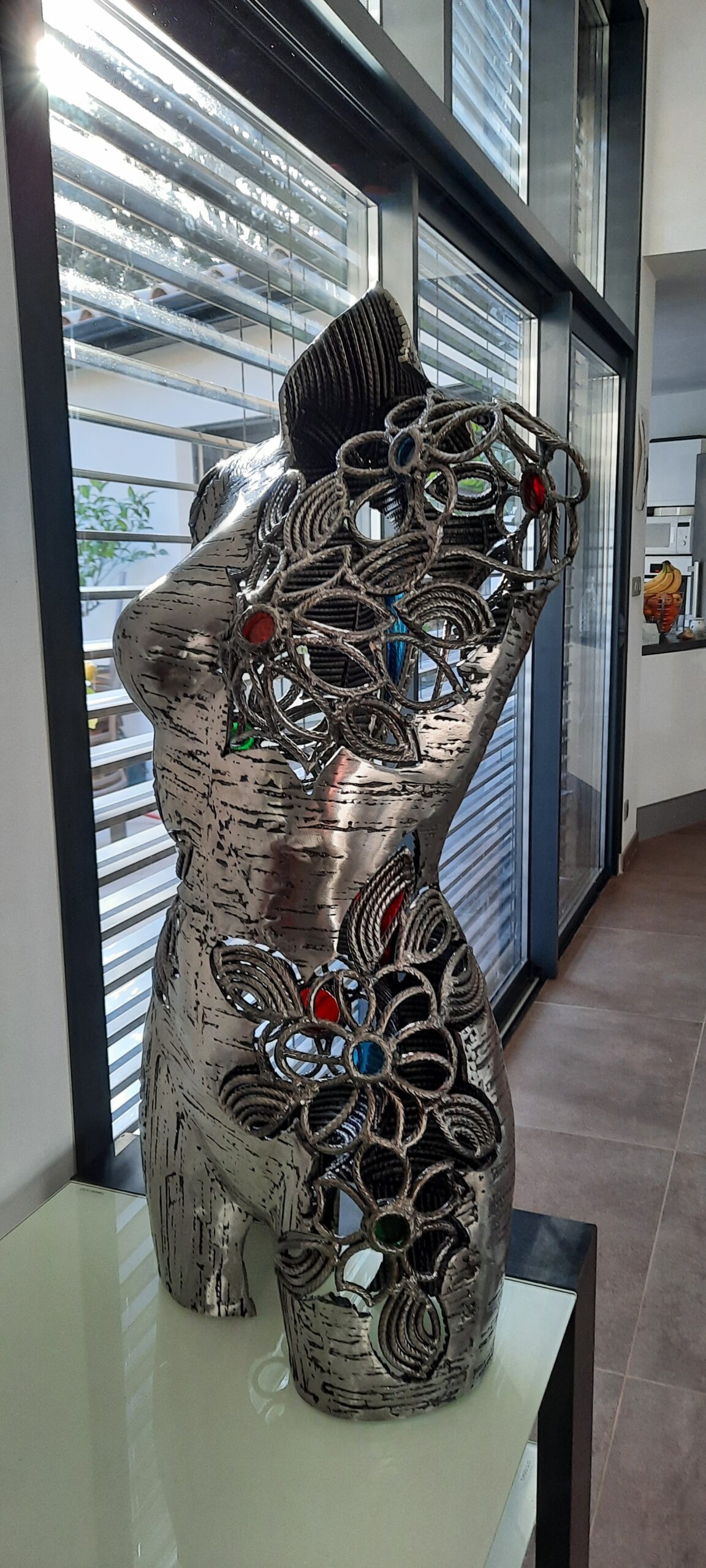 Plusieurs techniques ont été nécessaires pour donner vie à « Tatoo ». Tout d’abord la réalisation de la base du buste, par façonnage et assemblage de fer à béton, avec une finition semi poncée. Puis, le long travail de dentellière, où chaque ornement floral sculpté prendra naturellement sa place au sein de l’œuvre. Le dos quand à lui crée une rupture visuelle, avec des motifs plus symétriques.